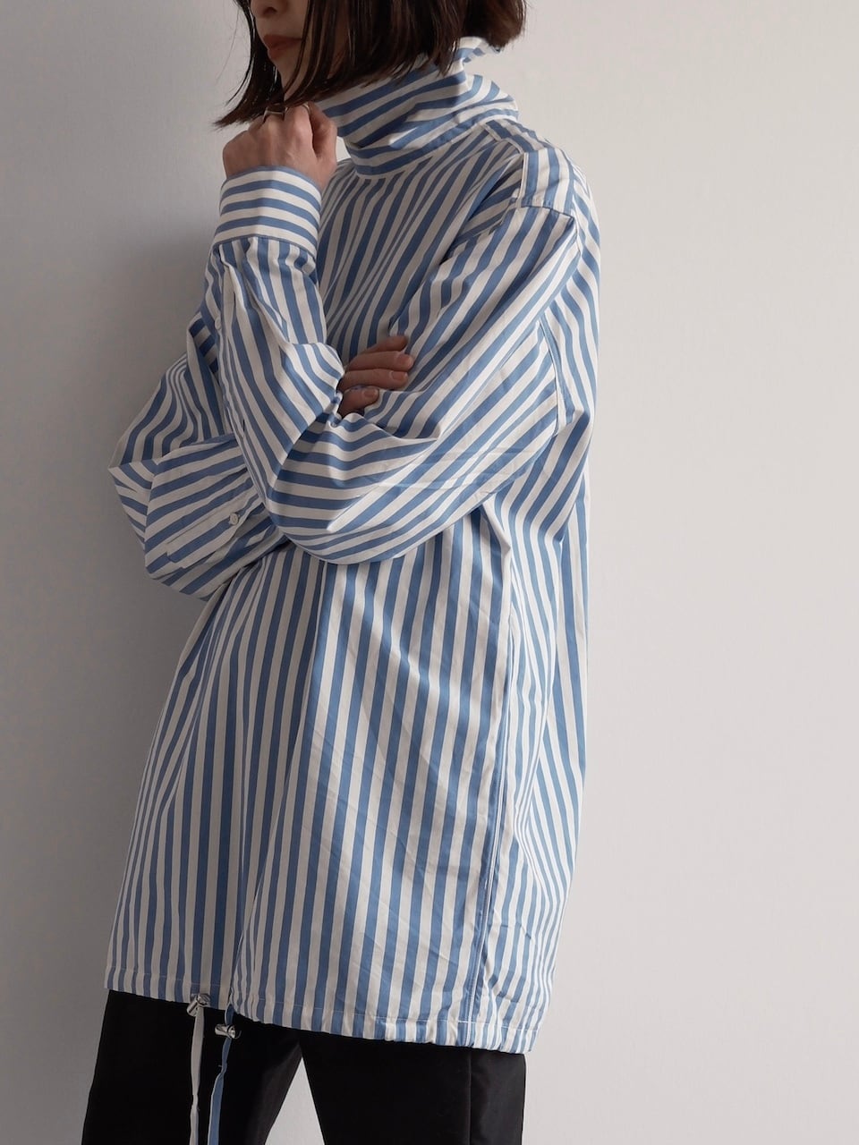 爽やかなブルー×ホワイトのストライプが印象的で、クラシックなシャツの要素を持ちながらもモダンなアレンジが加えられた一着です。