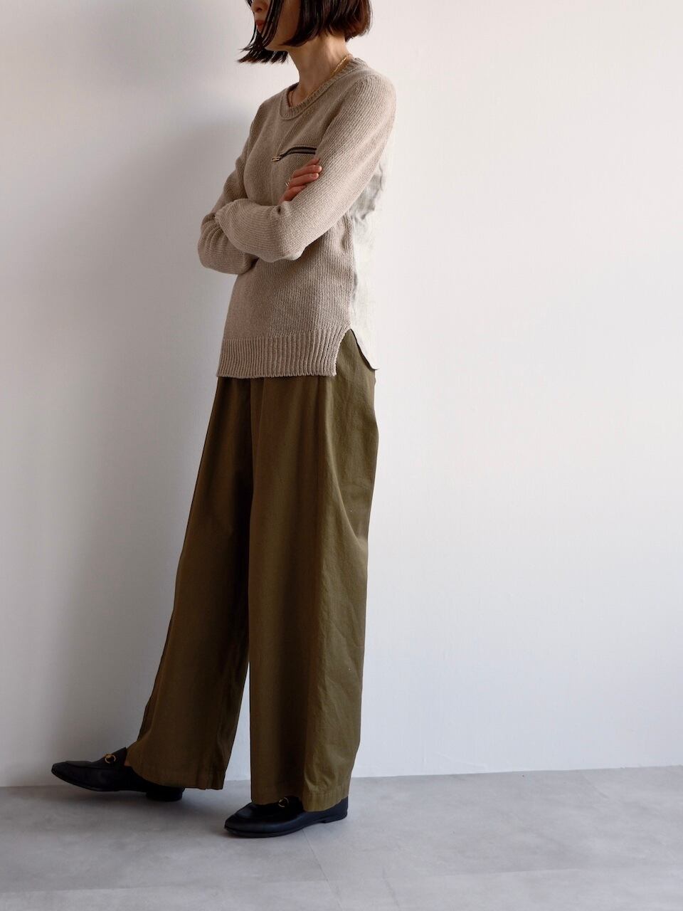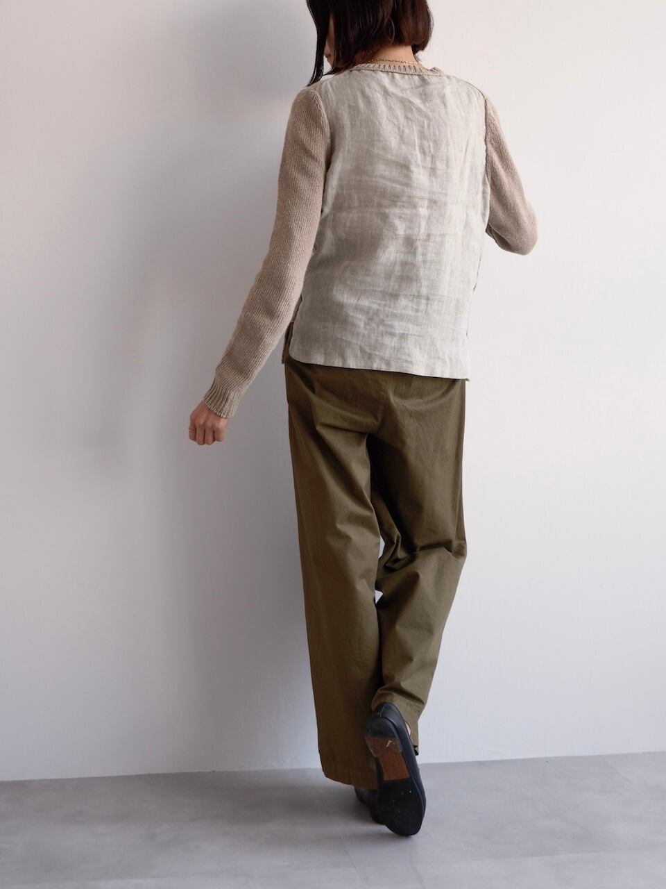 フロントはざっくりとした風合いが魅力のリネン×レーヨンのニット素材、バックスタイルはリネンの布帛地で切り替え、さらりと軽やかな表情をプラス。
