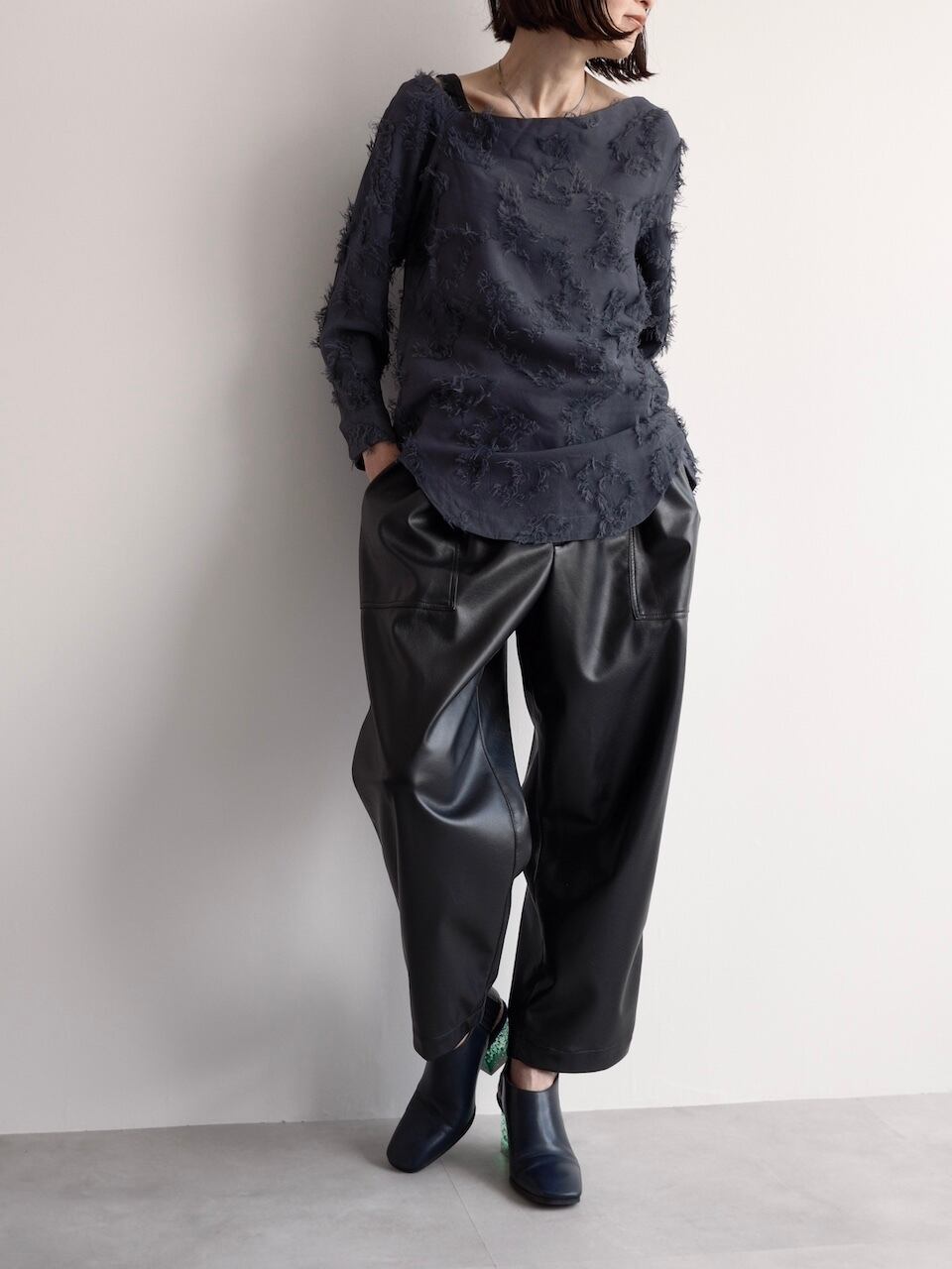 滑らかな質感の生地に、フリンジ状のカットワークを施すことで、立体的な表情を生み出し、動きに合わせて繊細な陰影が生まれるのが特徴です。