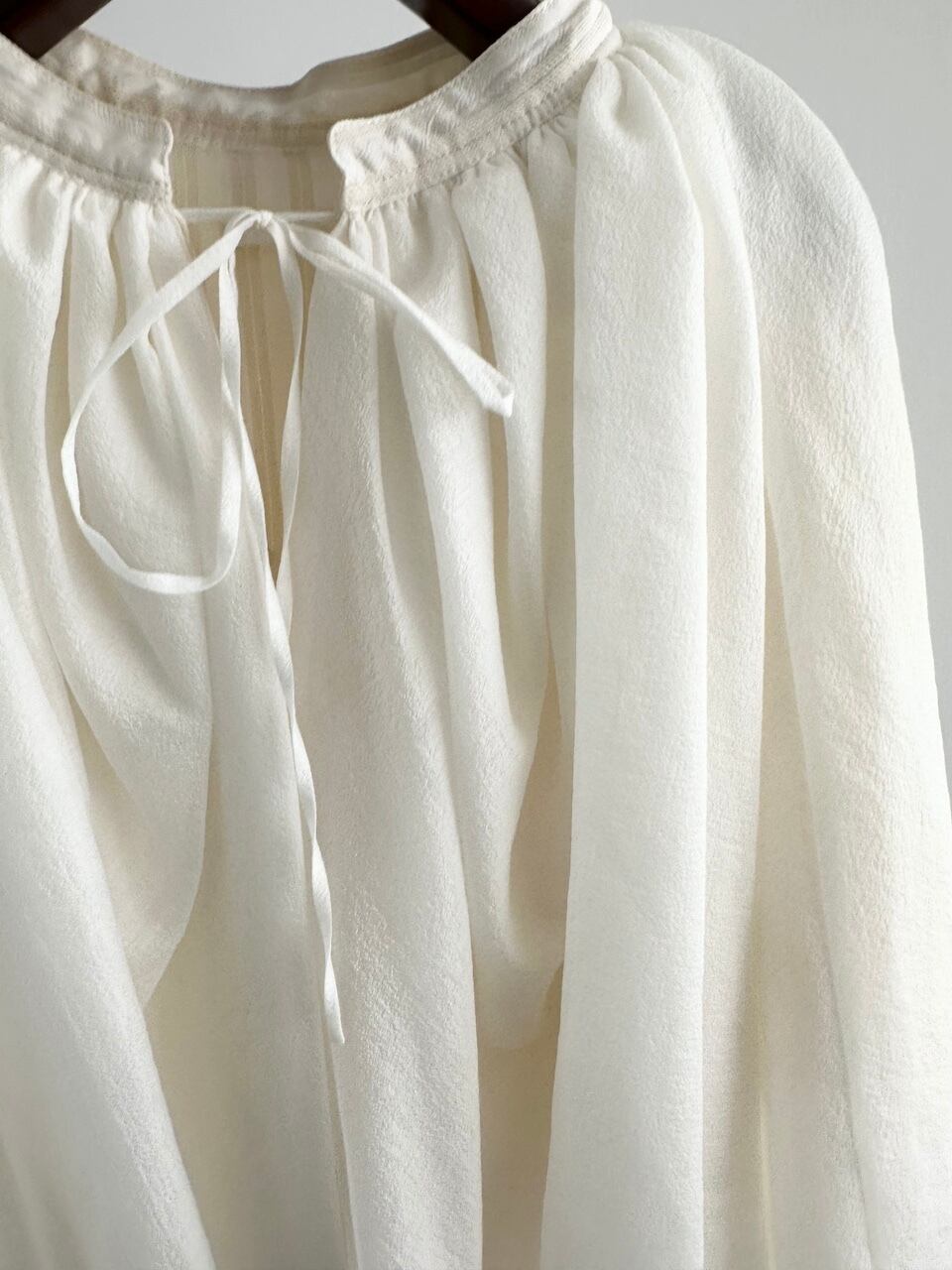 ネックラインは細いリボンで軽やかに結ぶ仕様。