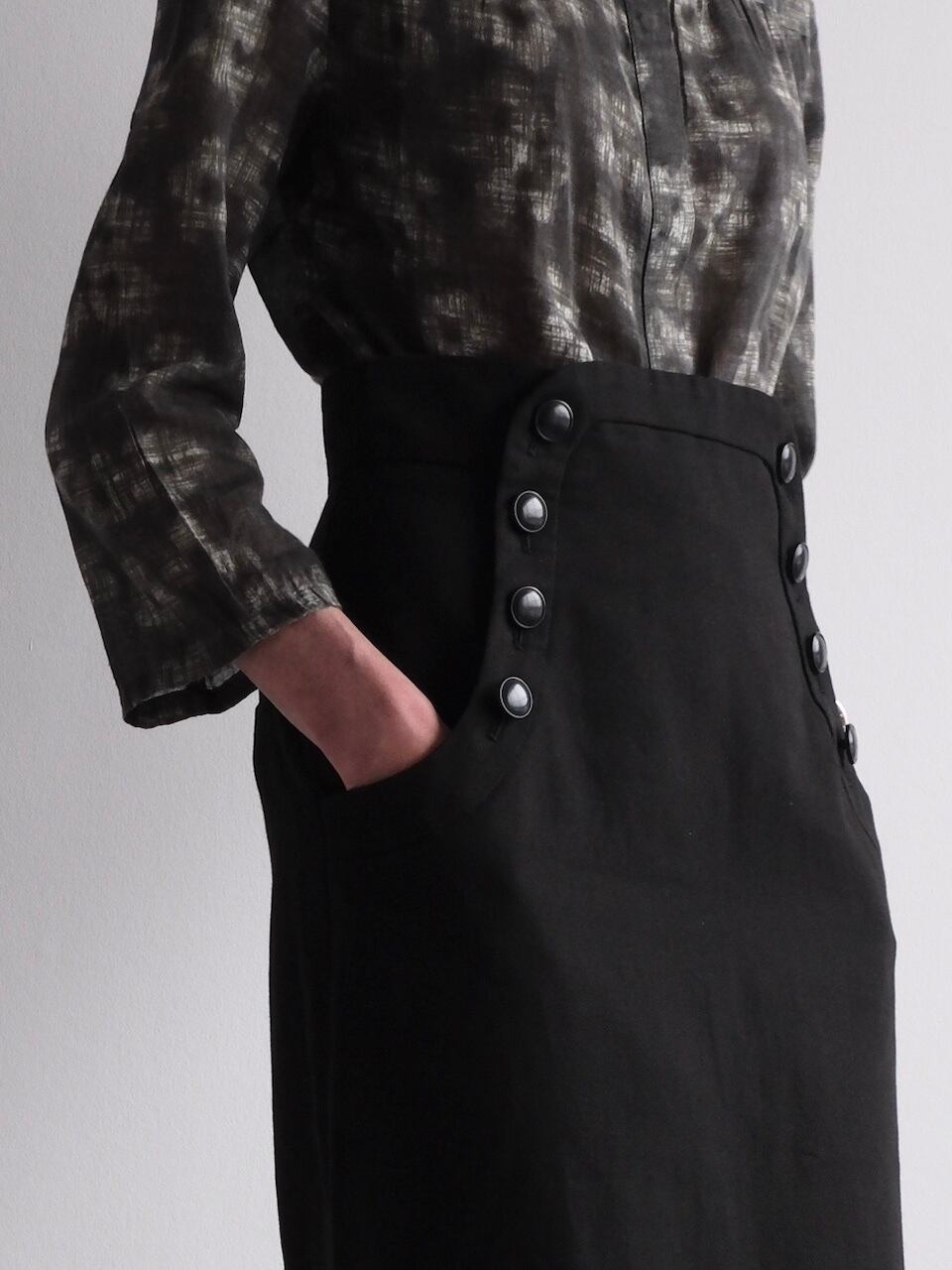 マメ クロゴウチのフロントに配されたボタンディテールが印象的なロングスカート。