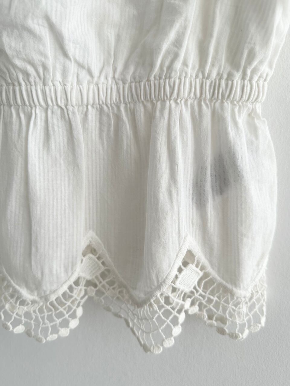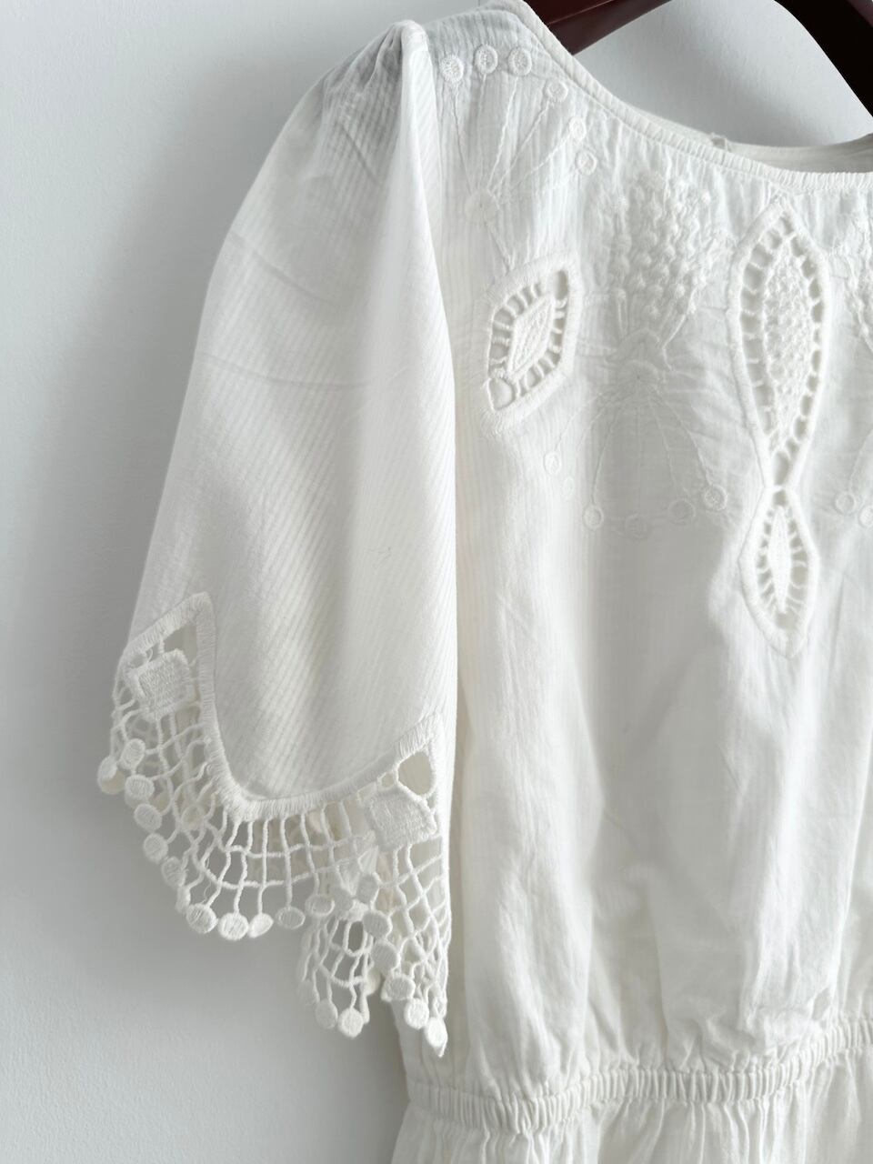ややフレアに広がるスリーブと、袖口と裾にほどこされたスカラップカットが涼しげでフェミニンな印象に。