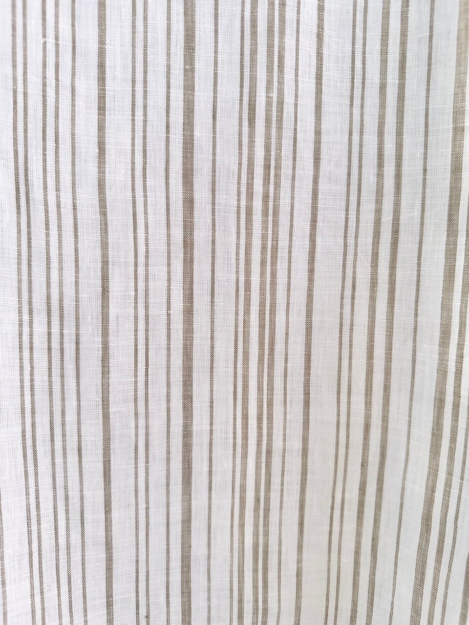 柔らかな生成り色に落ち着いたモカベージュのストライプが映える、ナチュラルで洗練された一枚です。