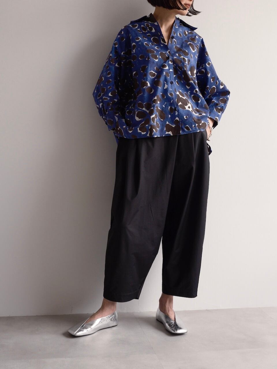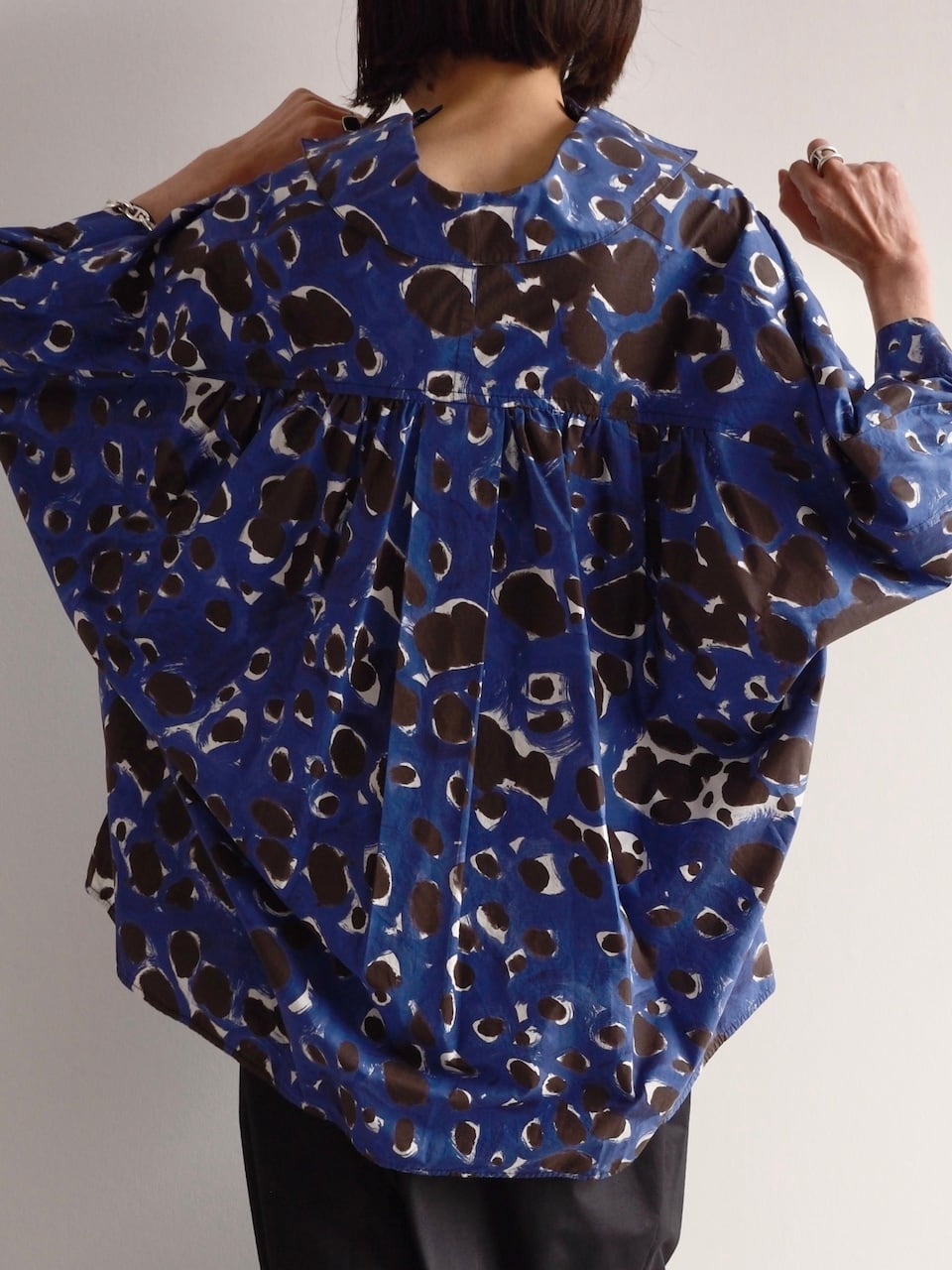 深みのあるブルーの地に、黒と白の抽象的なドット柄がランダムに重なり合い、絵画のような奥行きを感じさせる一着です。