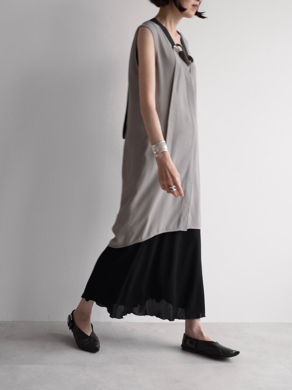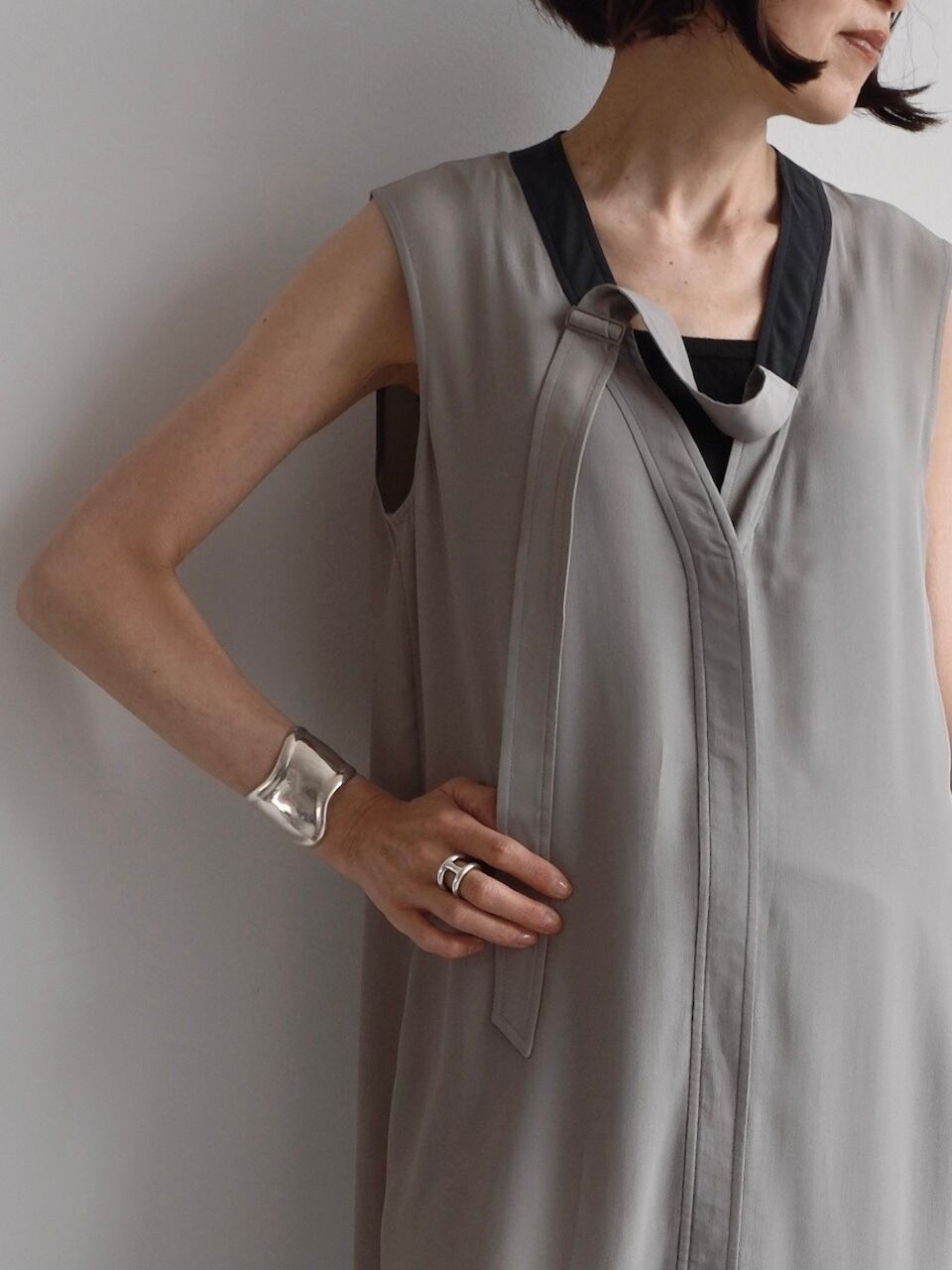 グレーとブラックのコントラスト配色がモダンな印象を与えつつ、襟元の片側に配されたバックル付きタイディテールがアクセントに。