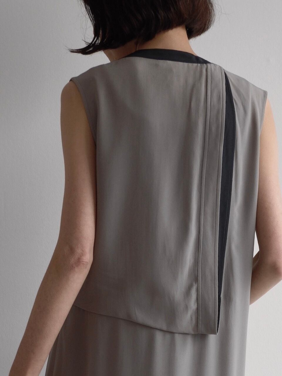 背面にはアシンメトリーに重なる布帛パネルがあしらわれ、動くたびにニュアンスを生み出します。