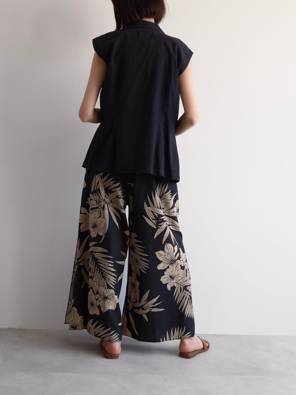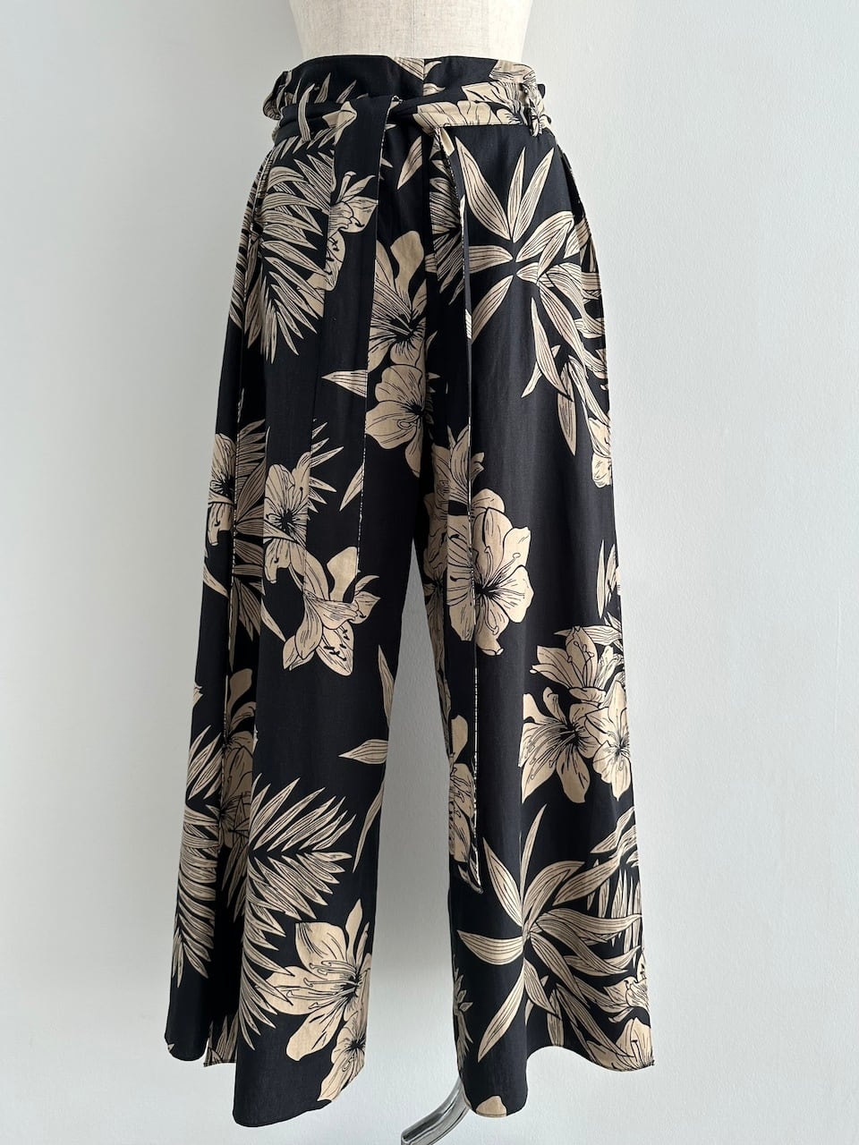 ブラック地にベージュのボタニカルモチーフが映える、大胆で美しいプリントが印象的な一着です。