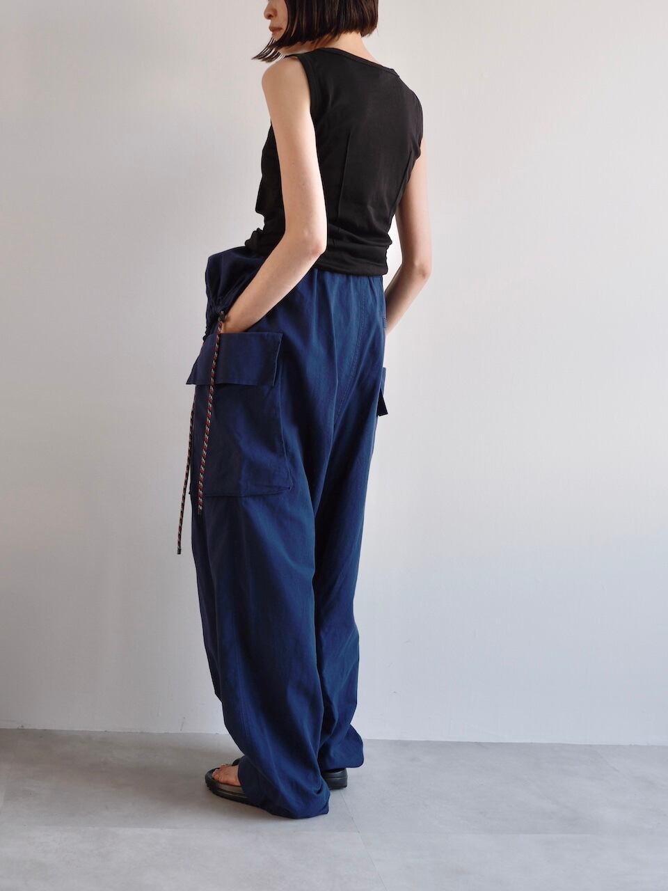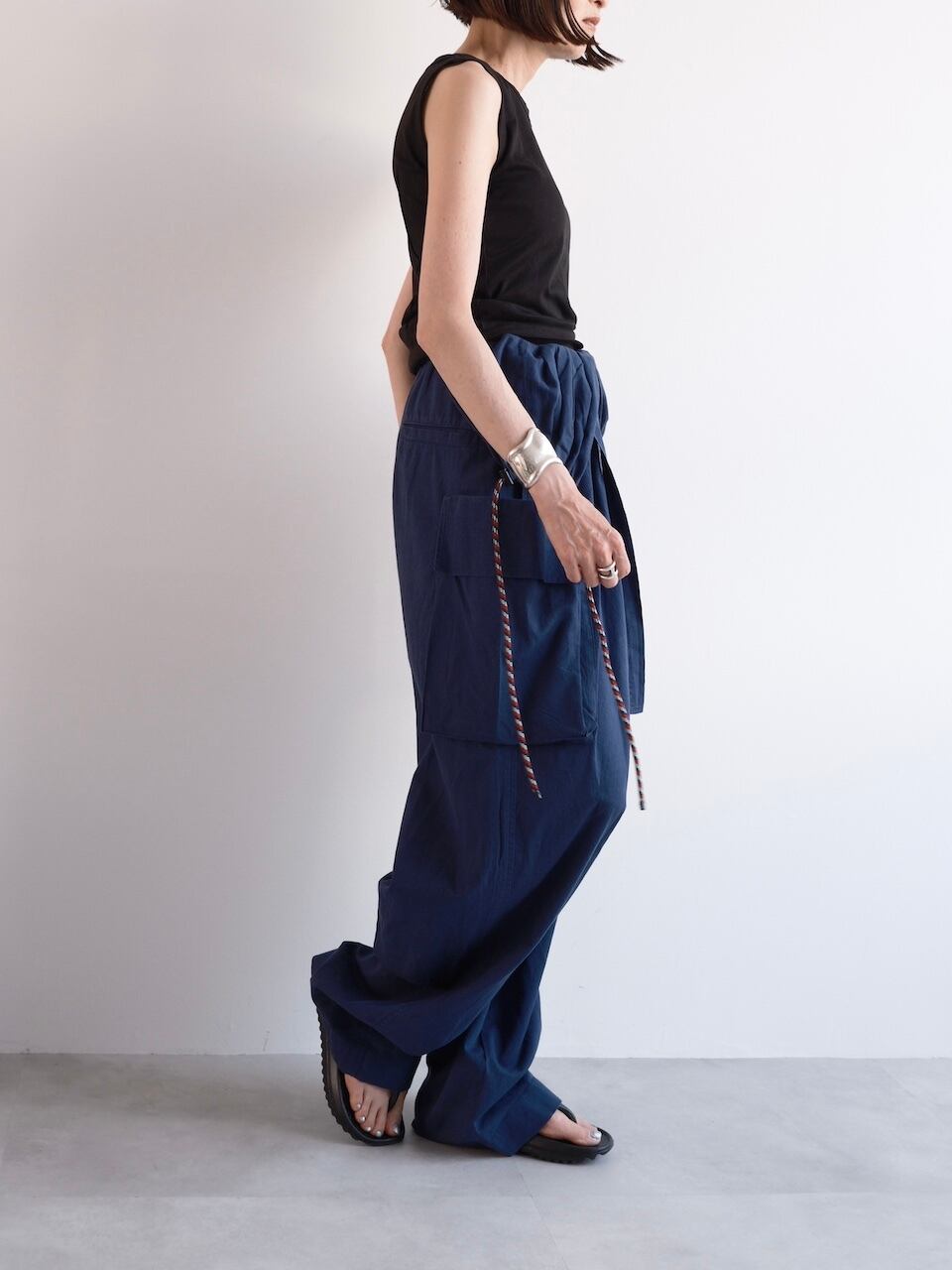 ゆったりとしたシルエットにミリタリーテイストを取り入れ、ロープストラップや大きなカーゴポケット、プラスチックバックル付きの共布ベルトなど、機能性とデザイン性を両立した一着。