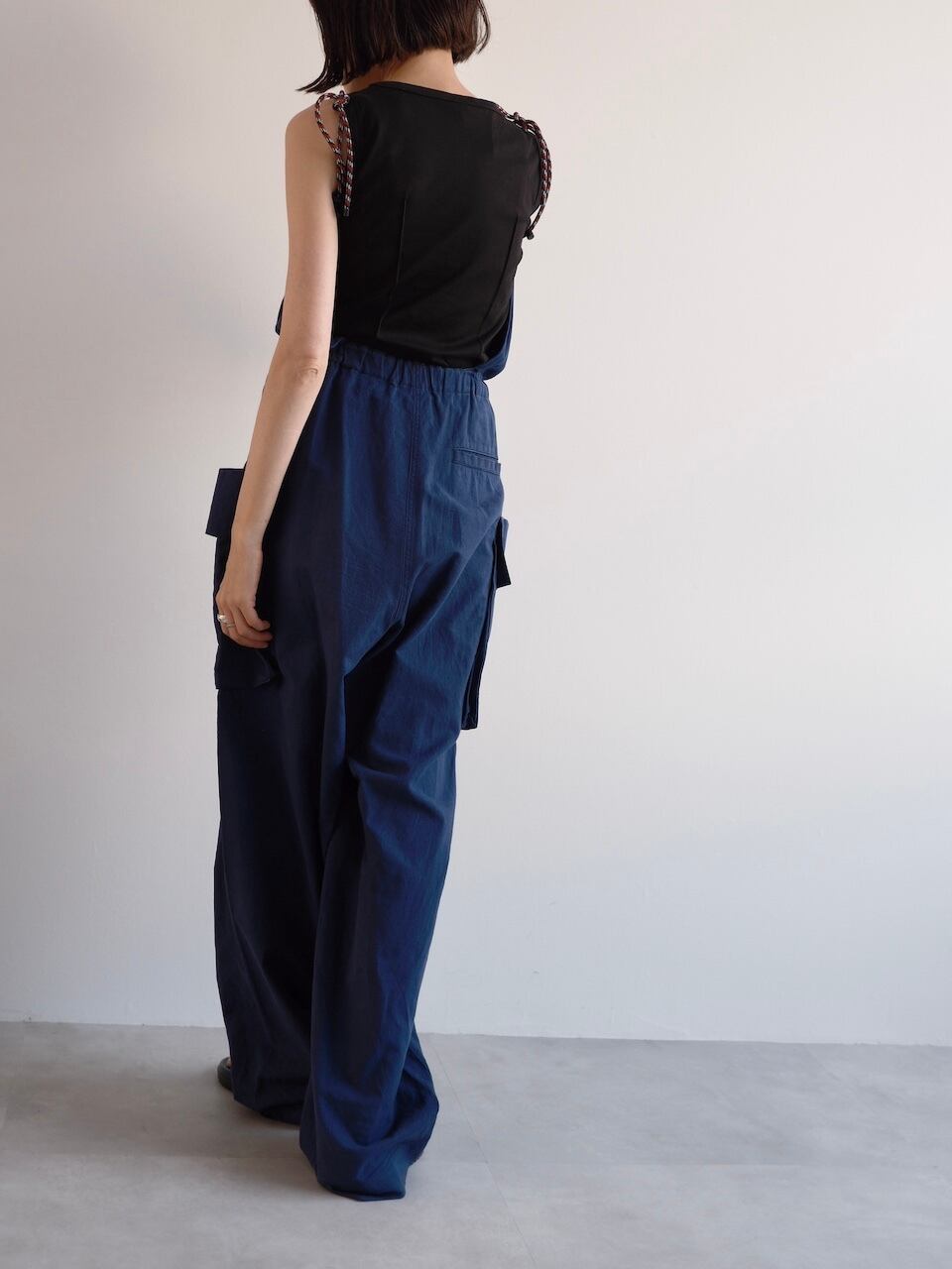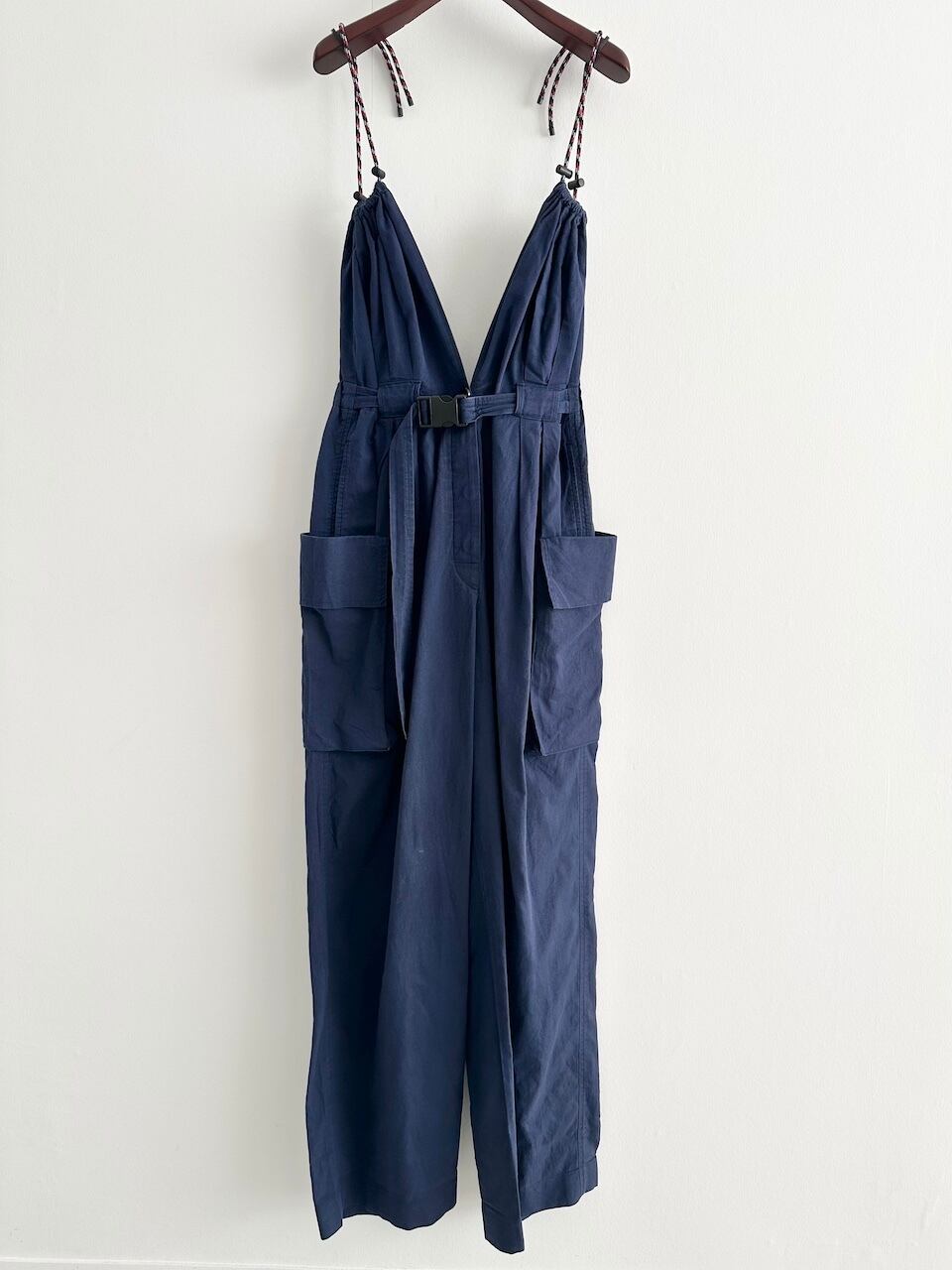 ストラップは調整可能で、スタイリングに応じてジャンプスーツとしても、垂らしてパンツのようにも着用可能な2WAY仕様。