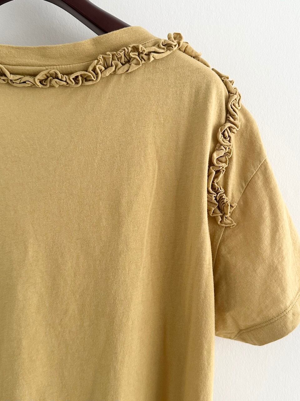 ネックラインから身頃にかけて、同色のコットン素材をクシュっと寄せたフリルで描かれたカーブラインが印象的な一枚です。