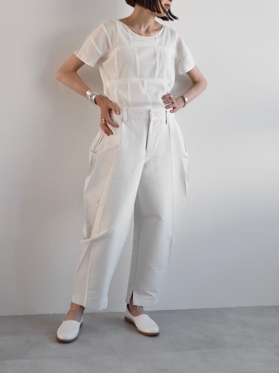構築的なタックワークが印象的な、ISSEY MIYAKEのホワイトパンツ。