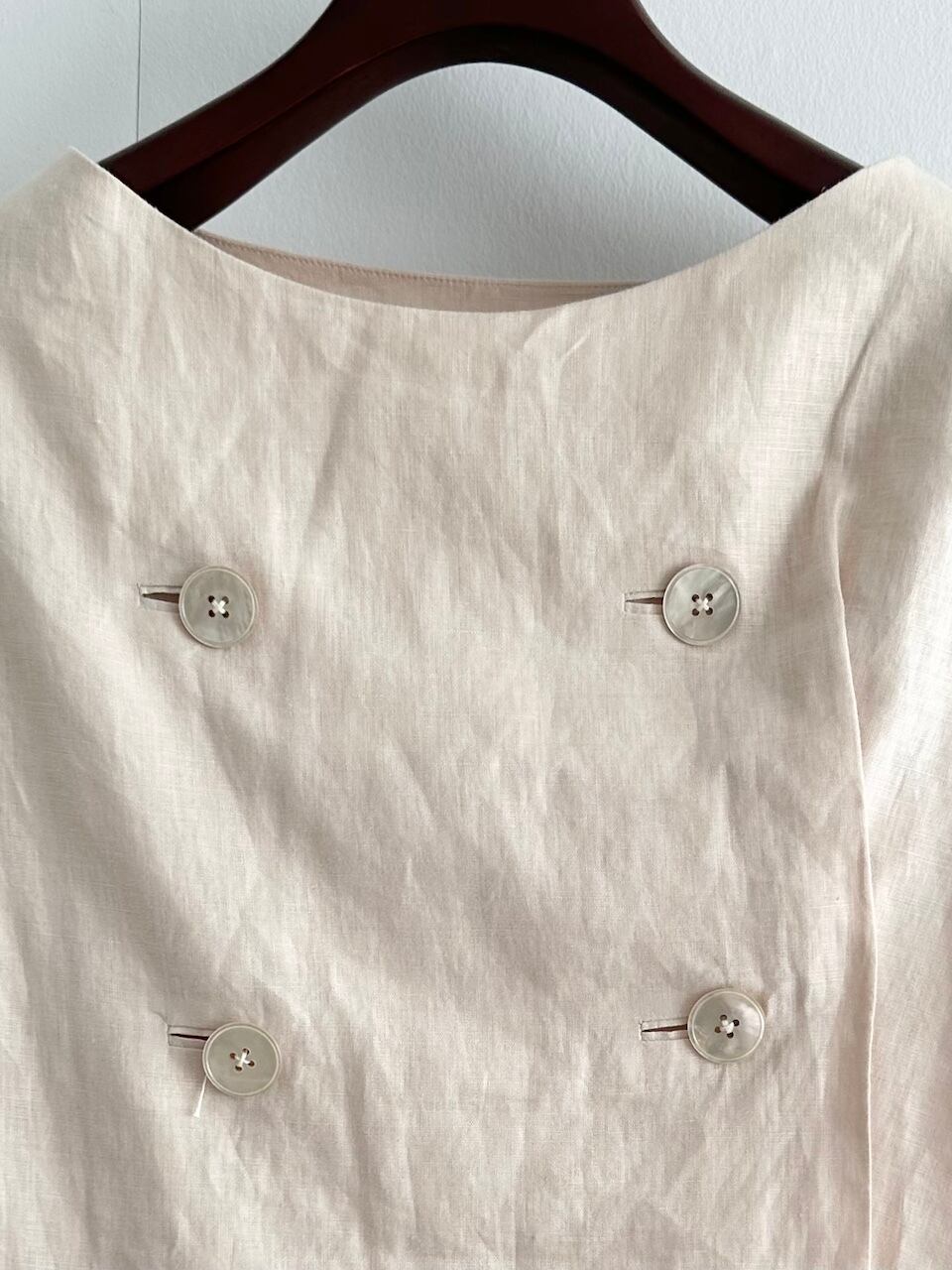 自然な光沢を湛える淡いピンクベージュトーンに、フロントのダブルボタンディテールが洗練されたアクセントを添えています。