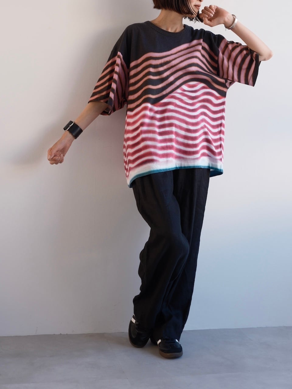 ブラックをベースに、ピンクやレッドのストライプ、裾のブルーグリーンがアクセントとなった配色は、動きと光を感じさせるアートピースのような存在感。
