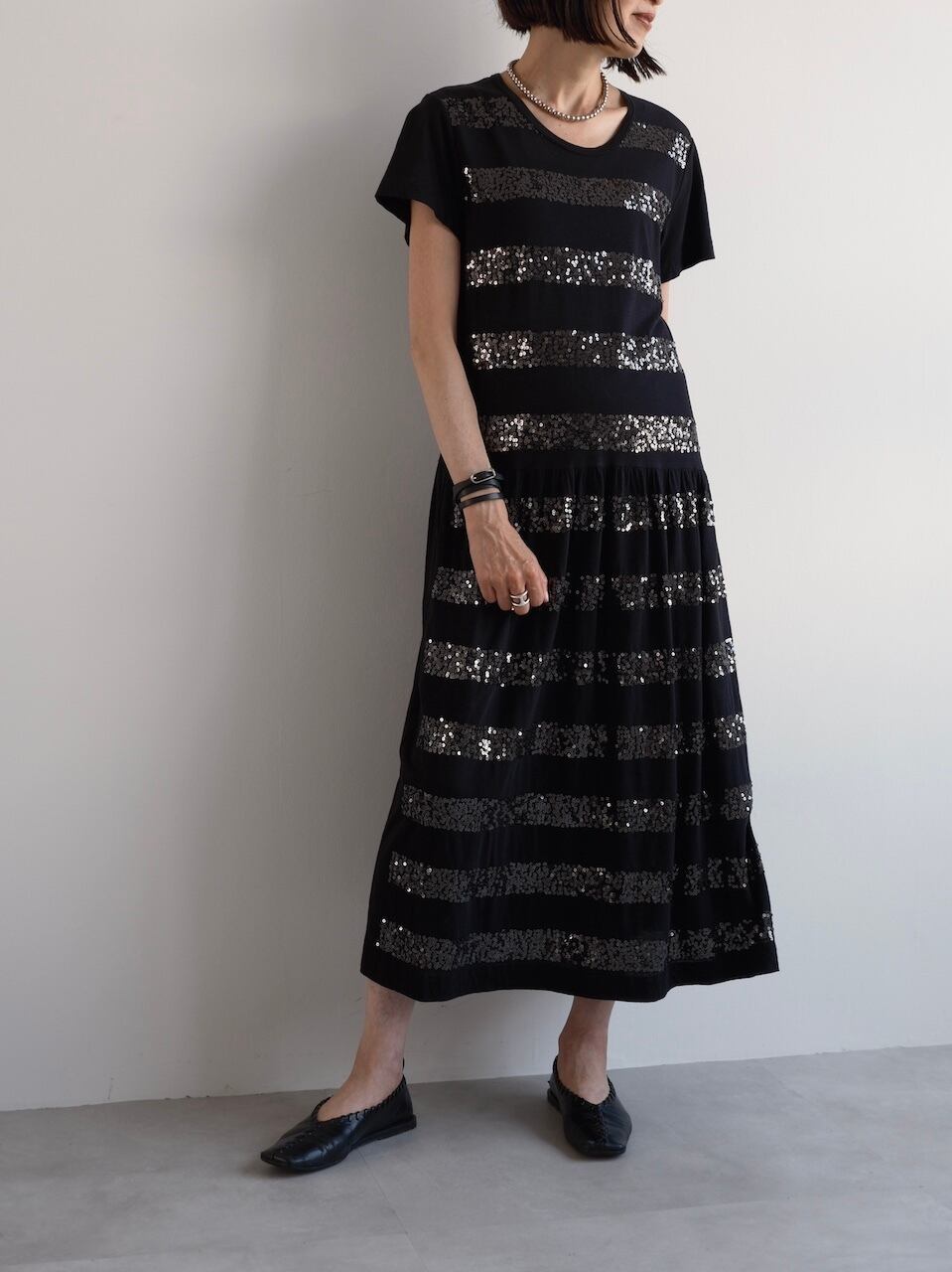 柔らかなコットン素材に、スパンコールをあしらったボーダー柄が印象的な半袖ワンピース。