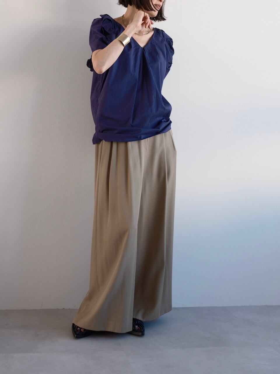軽やかな質感のコットン生地を使用し、ネックラインからのタックが生み出す自然なドレープがシルエットに奥行きを加えています。