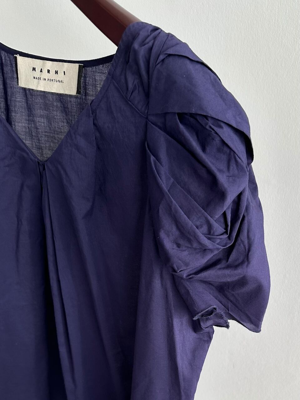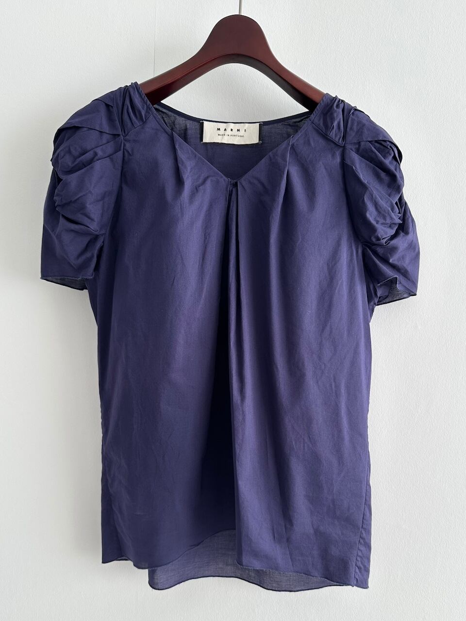 立体的なギャザーを重ねたパフスリーブが視線を引く、MARNIのコットンブラウス。