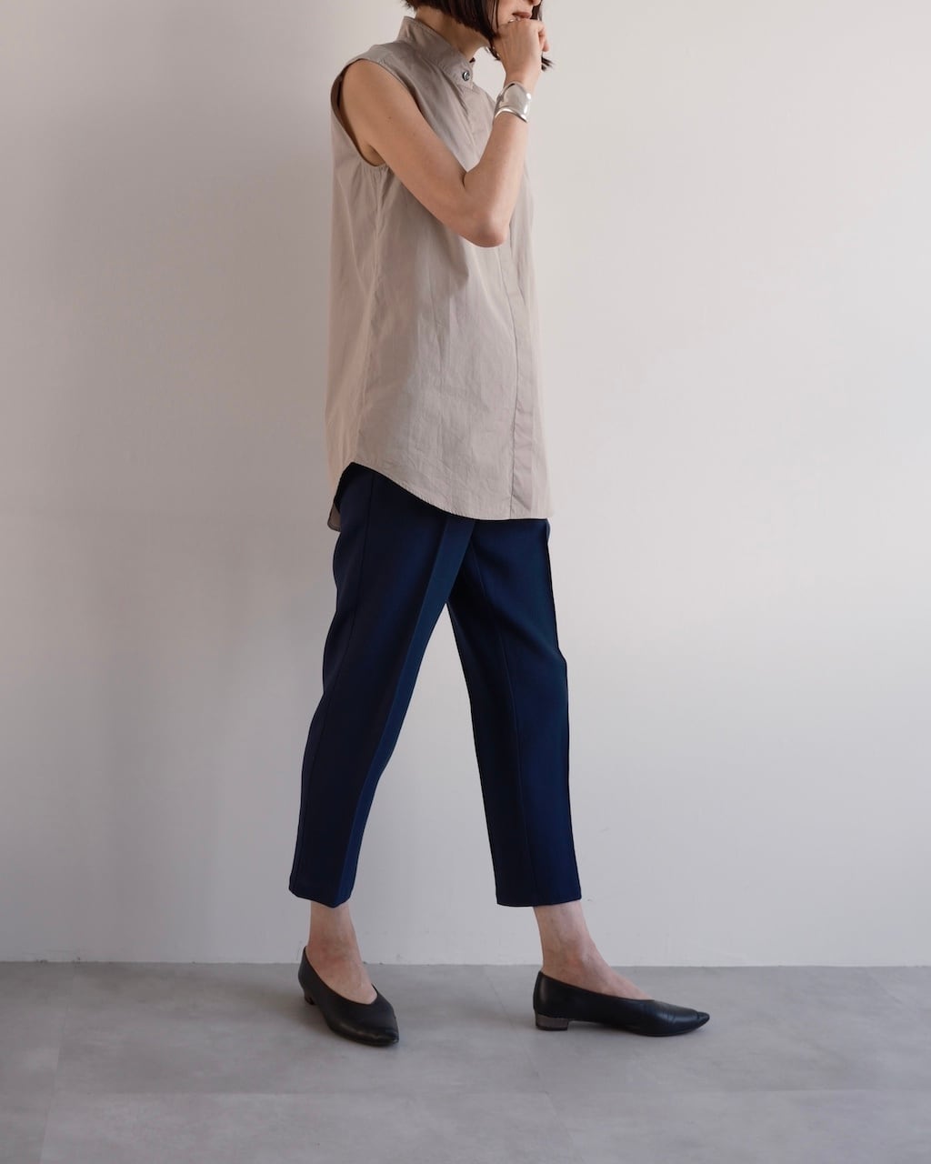 裾にかけて自然に細くなるラインと短めの丈感で、足元を軽やかに見せてくれます。