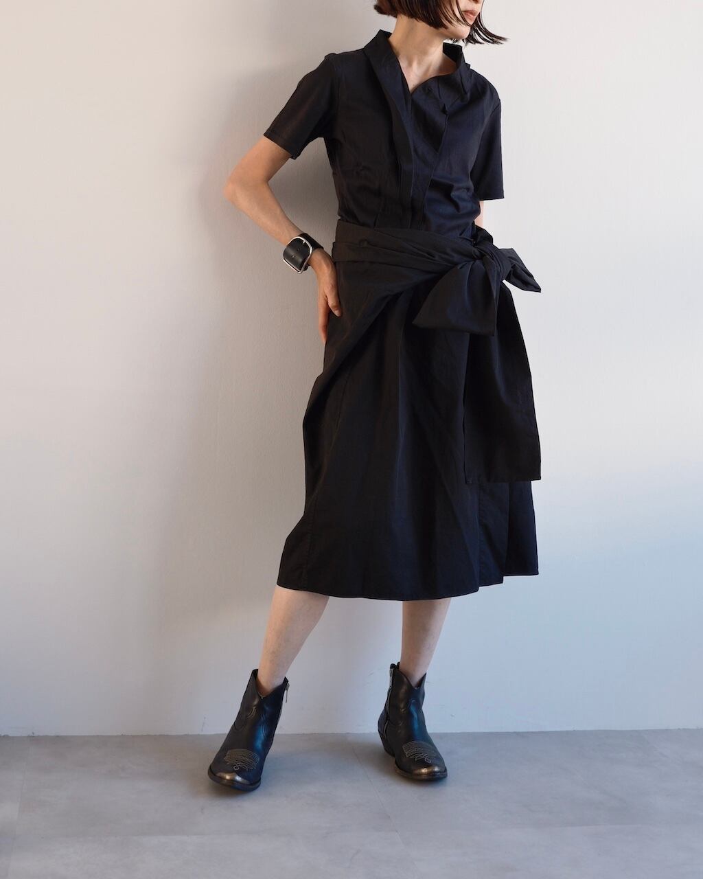 首元でリボンを結んでショールやポンチョのように羽織るスタイルと、ウエストに巻き付けてスカートのように着こなすスタイル。一枚で2通りの表情を楽しめる、DRIES VAN NOTENらしいアイテムです。