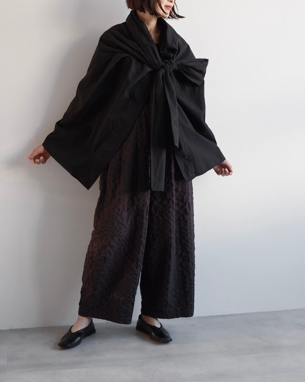 シンプルなブラックのトーンがモード感を引き立て、スタイリングの主役として存在感を放ちます。
