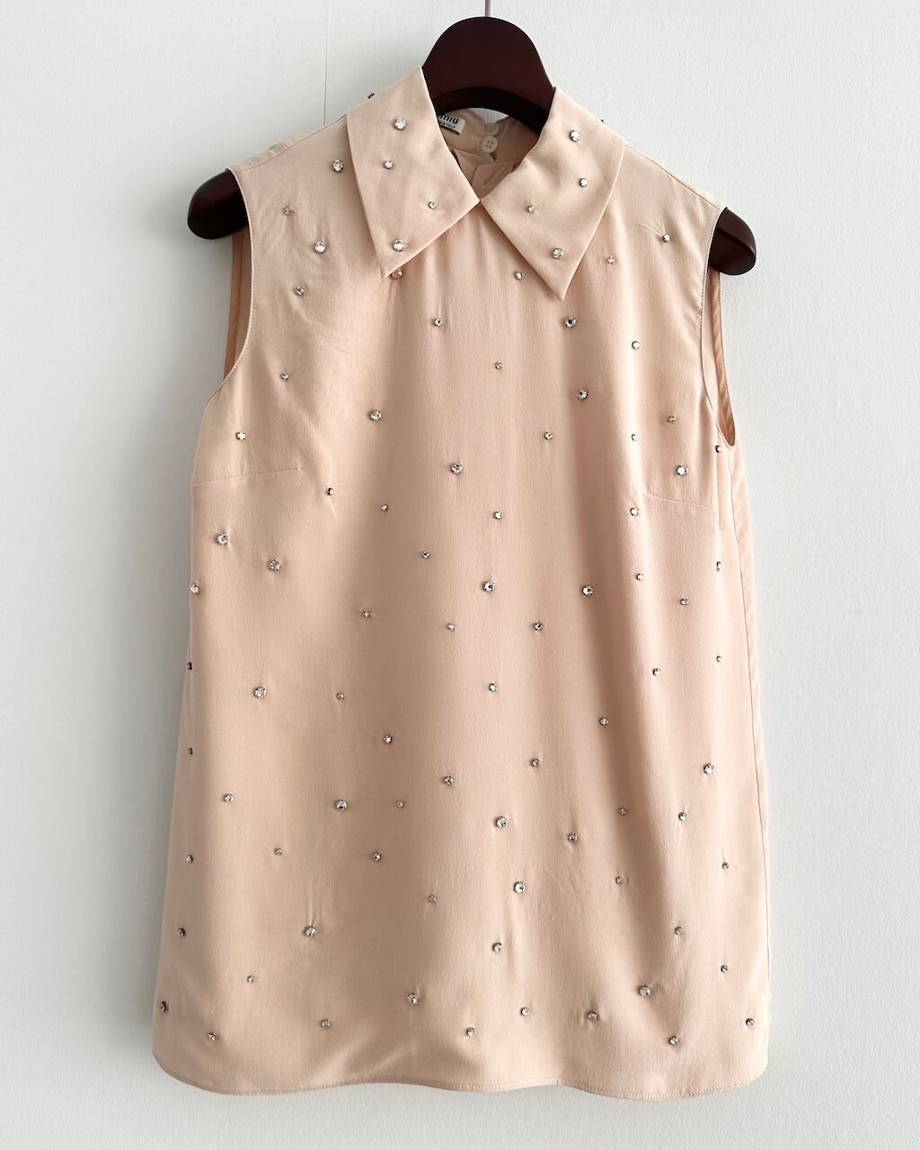 柔らかなヌードピンクのシルクに、クリスタルがランダムに散りばめられたMiu Miuのノースリーブブラウス。