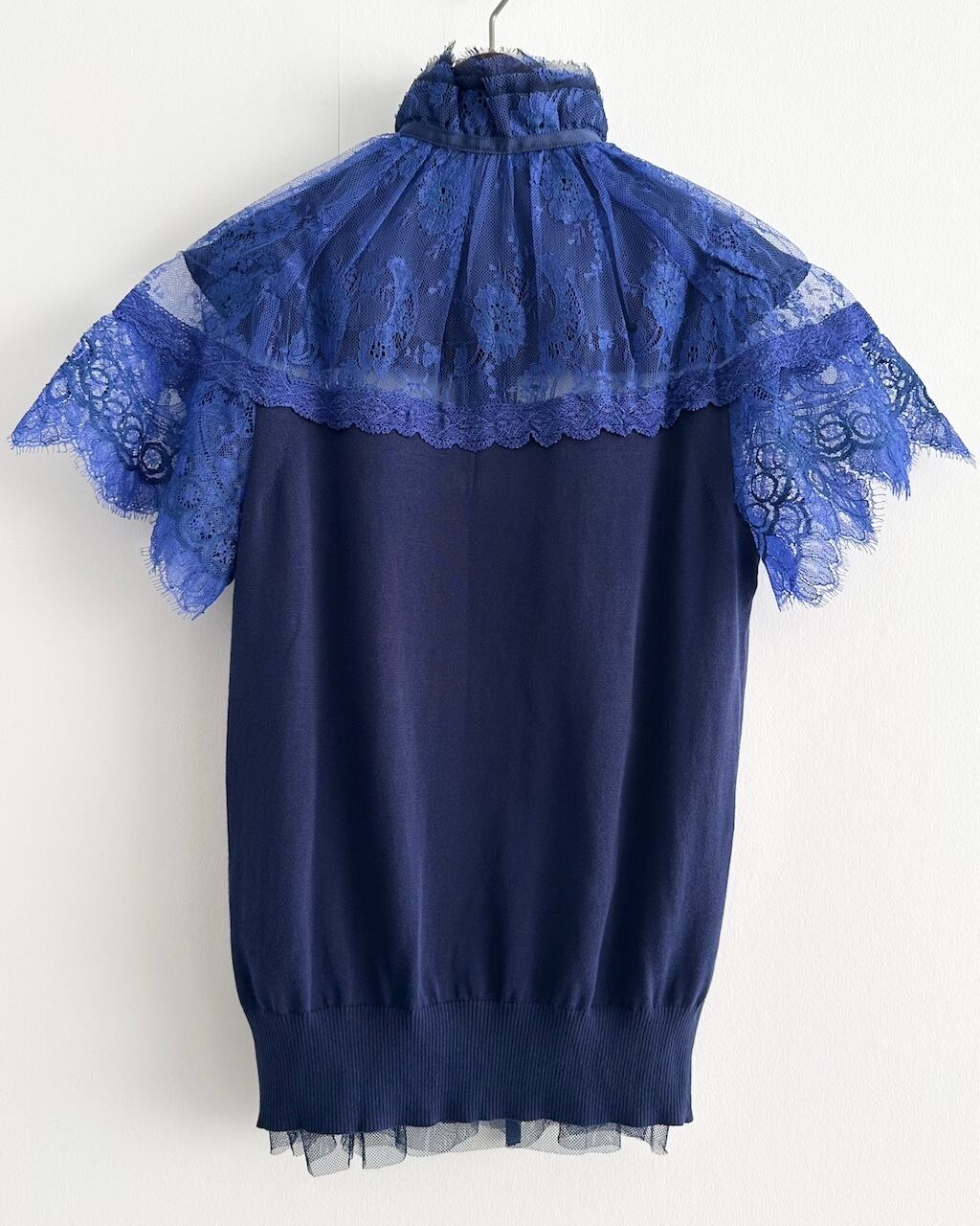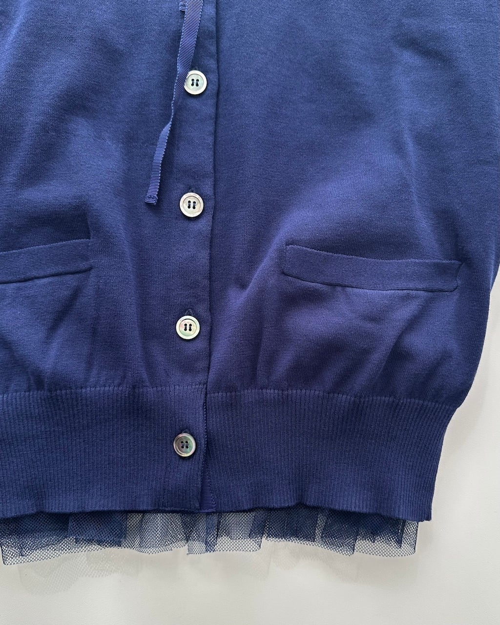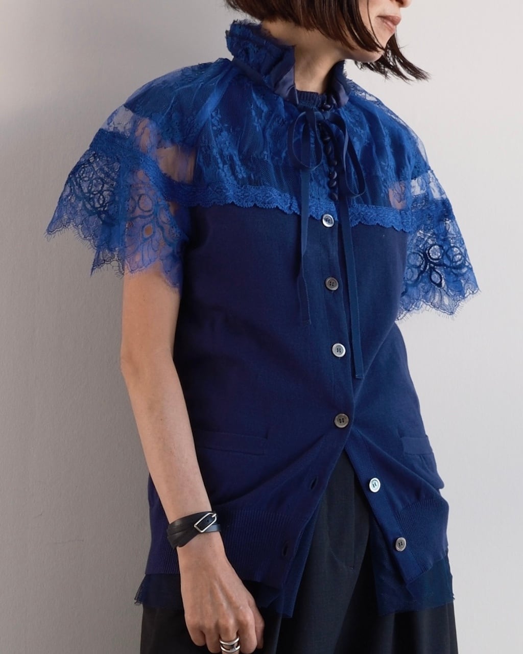 ネイビーのコットンニットをベースに、鮮やかなブルーのレースとチュールを重ねたsacaiのカーディガン。