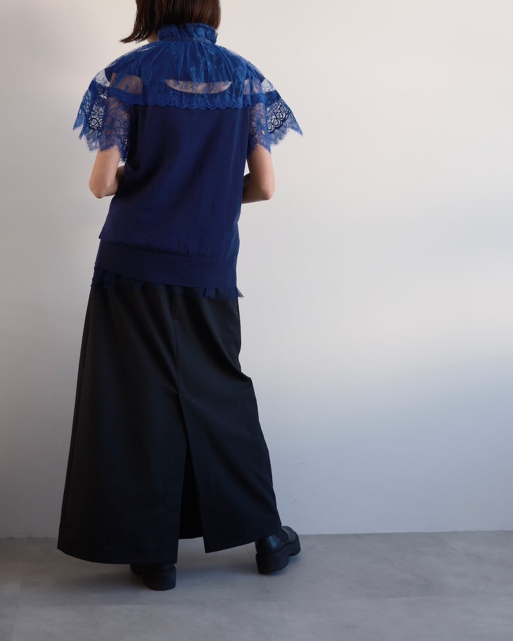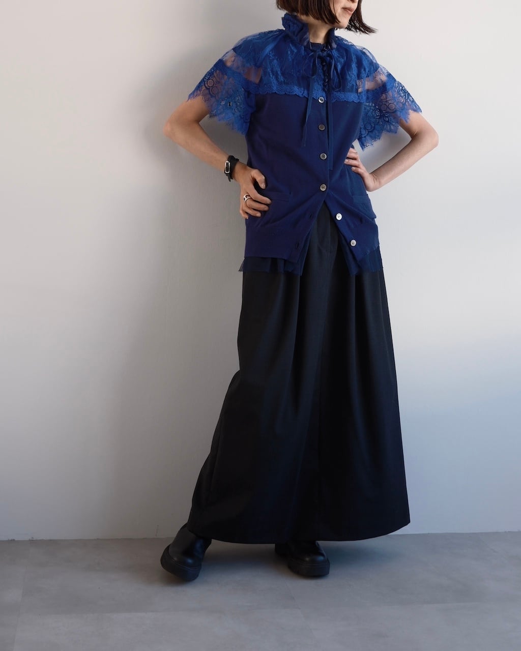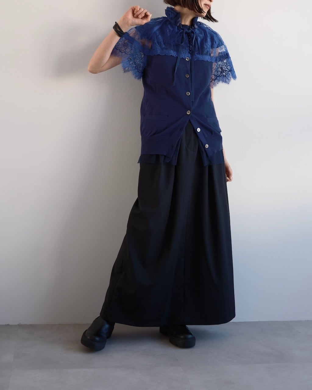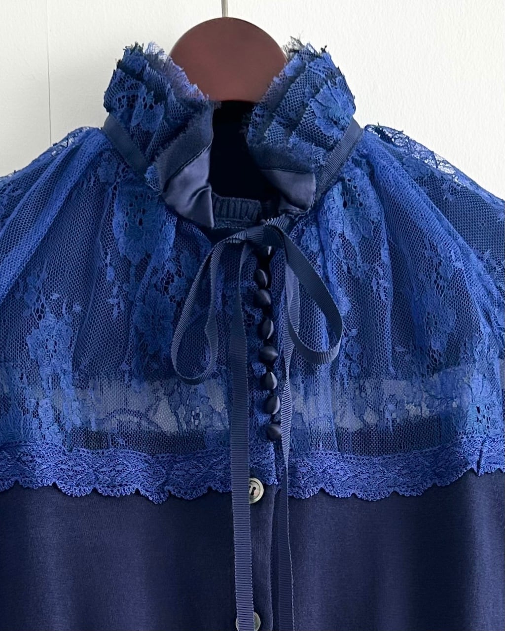 ネイビーのコットンニットをベースに、鮮やかなブルーのレースとチュールを重ねたsacaiのカーディガン。