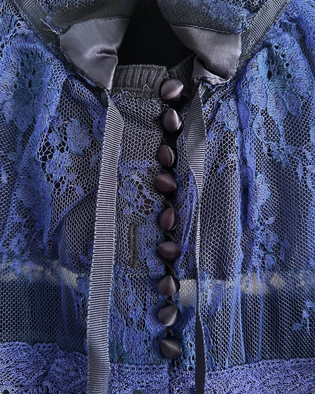 スタンドカラーにはサテンのくるみボタンとグログランテープのリボンがあしらわれ、首元から肩に広がるレースケープが印象的なデザインです。