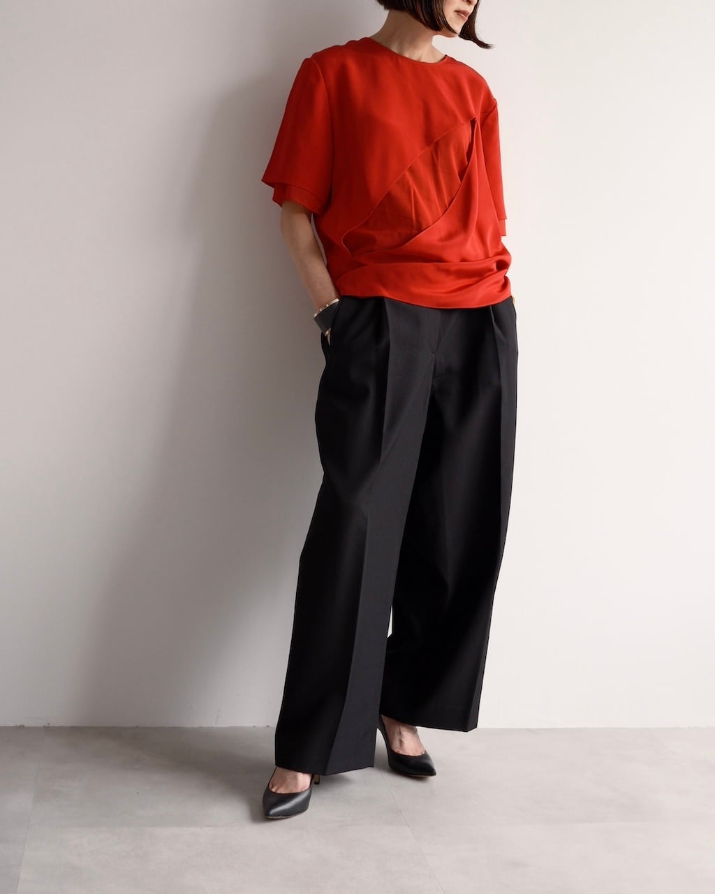 鮮やかなスカーレットカラーが印象的な、PETER DOの「SLASH TOP」