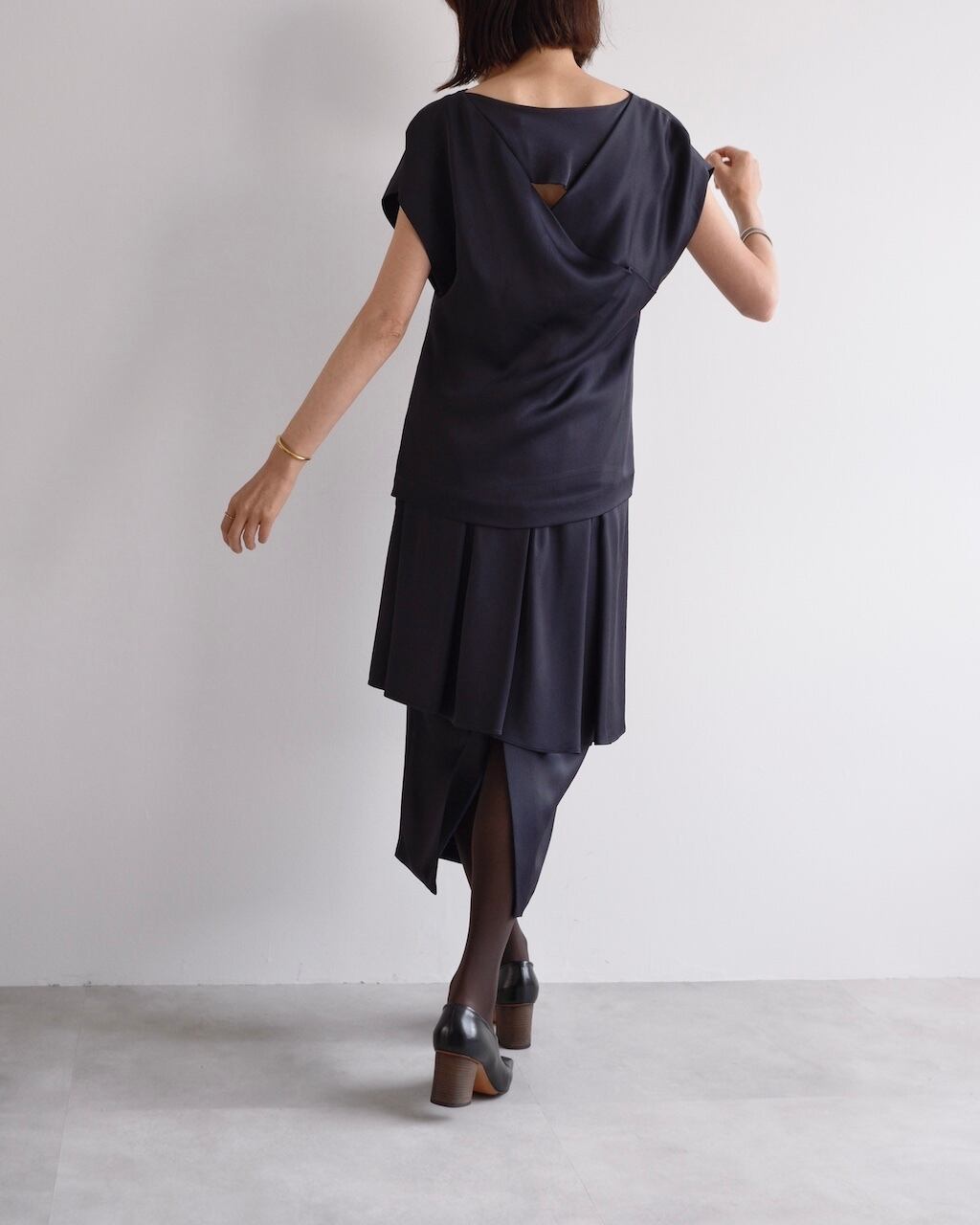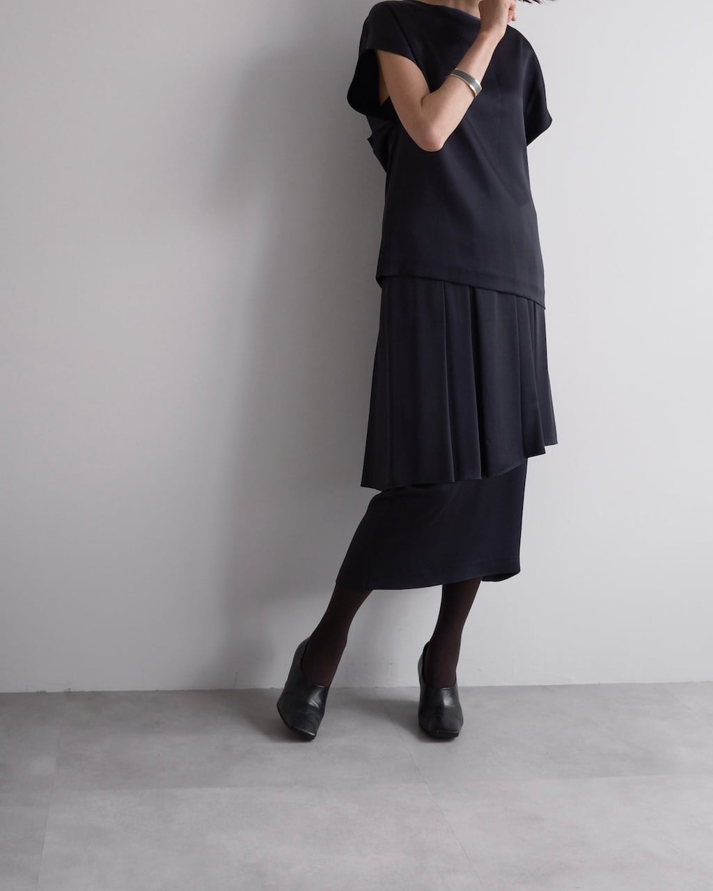 スカートはロングタイトなシルエットに、上からプリーツが重なるレイヤードデザイン。