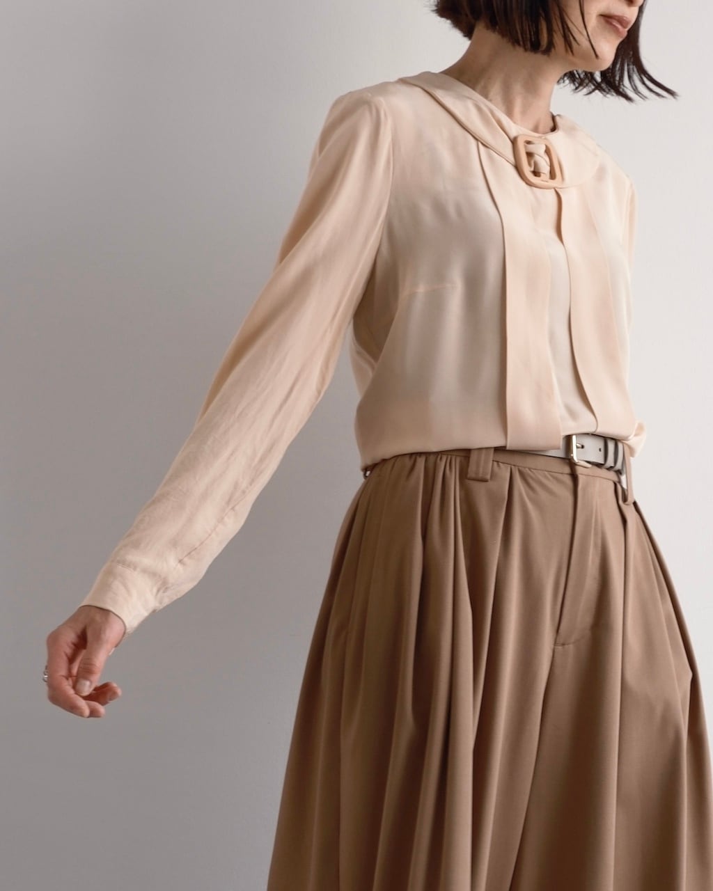 シルクならではの艶やかな落ち感が身にまとう人の動きに合わせて美しく揺れ、上品な印象を与えてくれる大人なブラウスです。