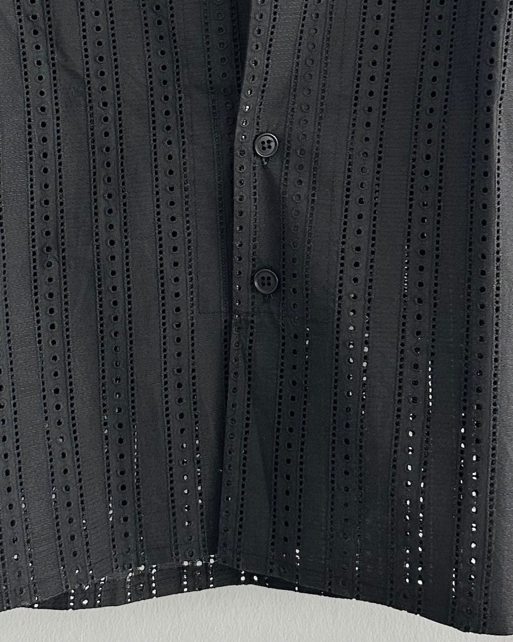 規則的に並ぶストライプ状のカットワークが、ブラックの生地に奥行きと軽やかな抜け感を与えています。