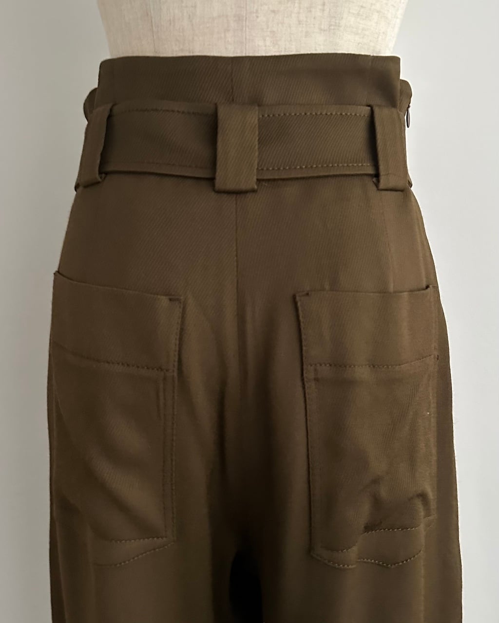 ハイウエストの構築的なシルエットが腰まわりをすっきりと見せ、さらに裾にかけて緩やかに落ちる美しいシルエットに。