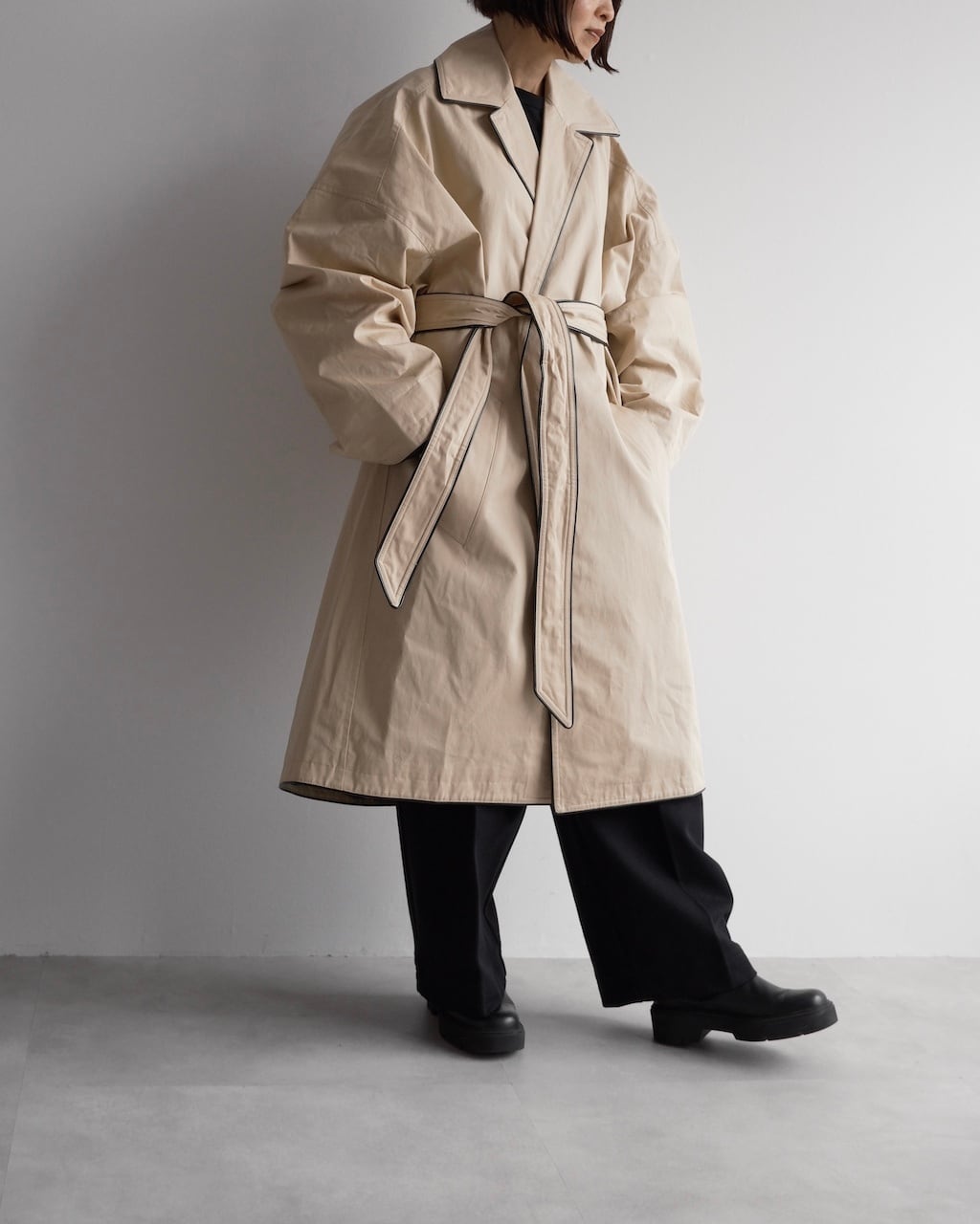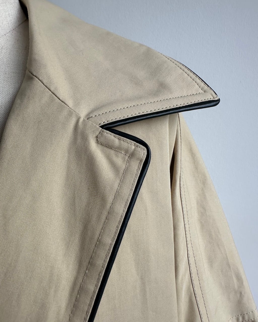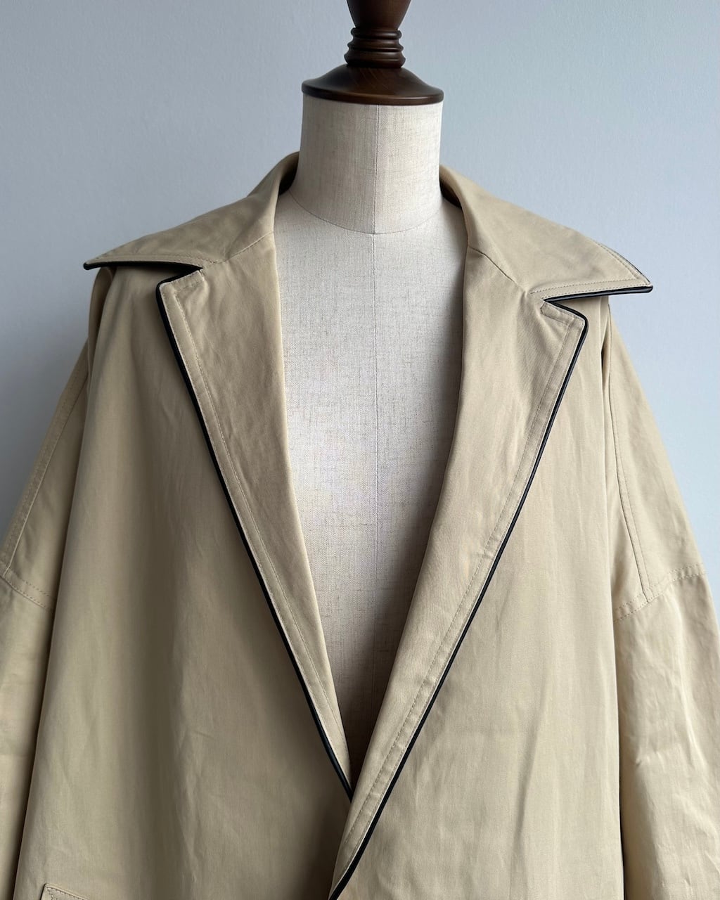 やや黄味がかったベージュにブラックレザー調のパイピングを効かせた、端正でありながらモダンな一着。