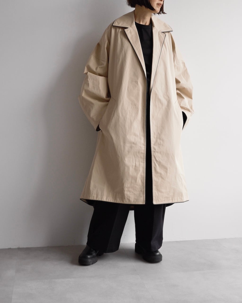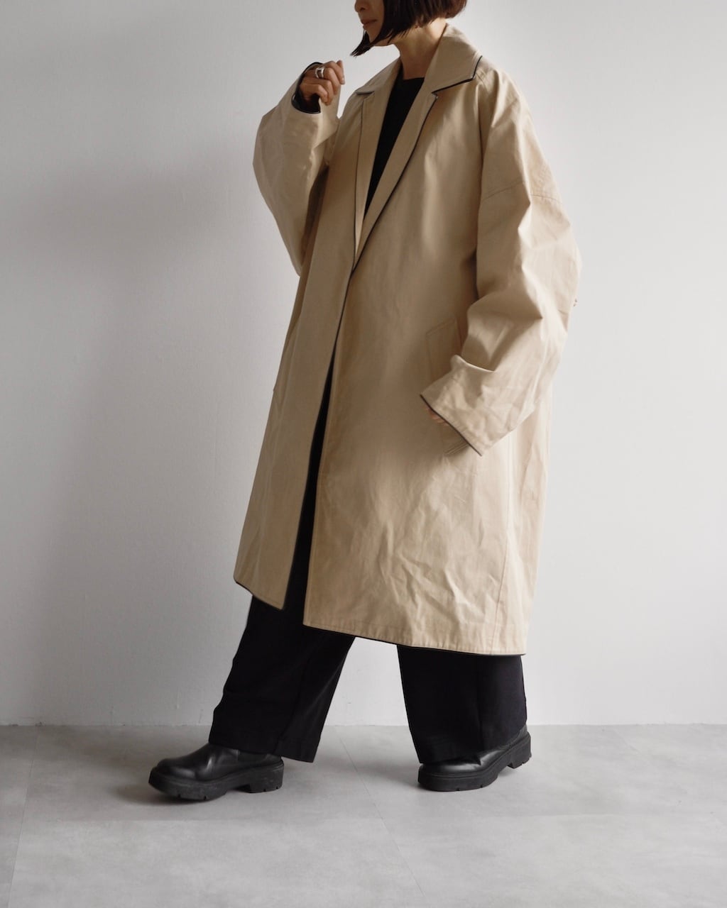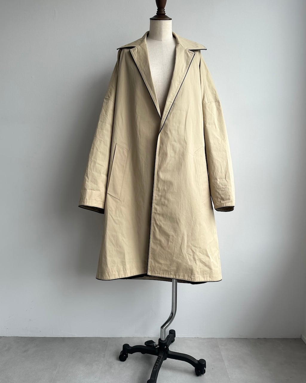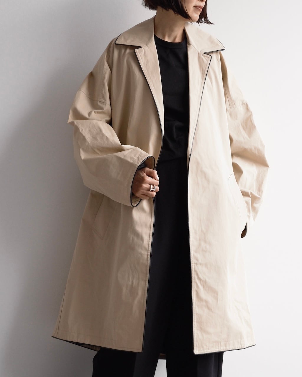 やや黄味がかったベージュにブラックレザー調のパイピングを効かせた、端正でありながらモダンな一着。