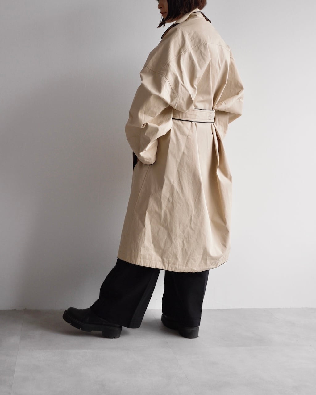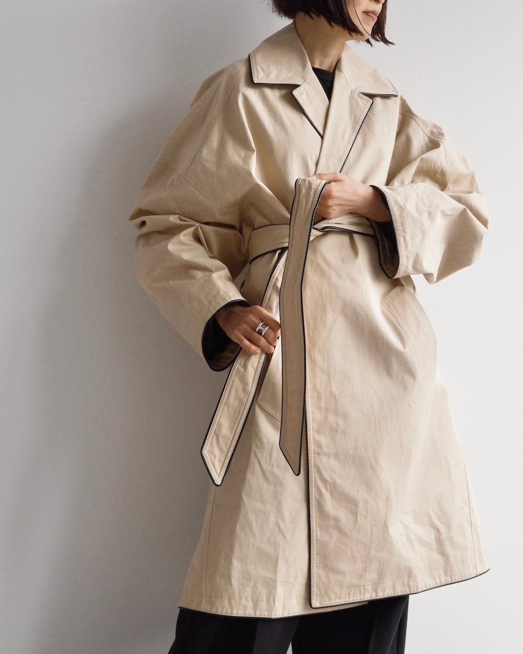 ウエストをマークすることで、たっぷりとしたシルエットから立体的でメリハリのある印象へと変化を楽しめます。
