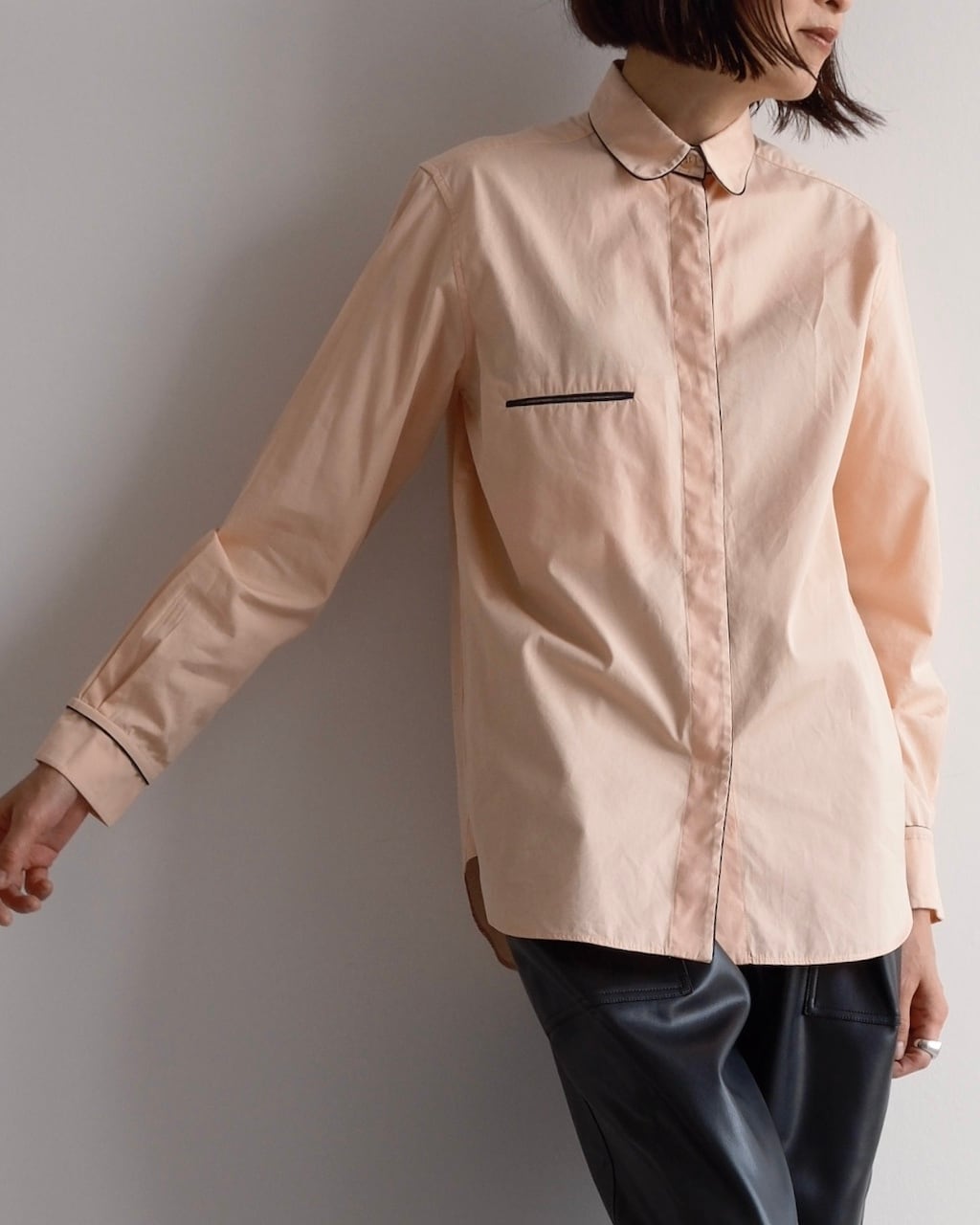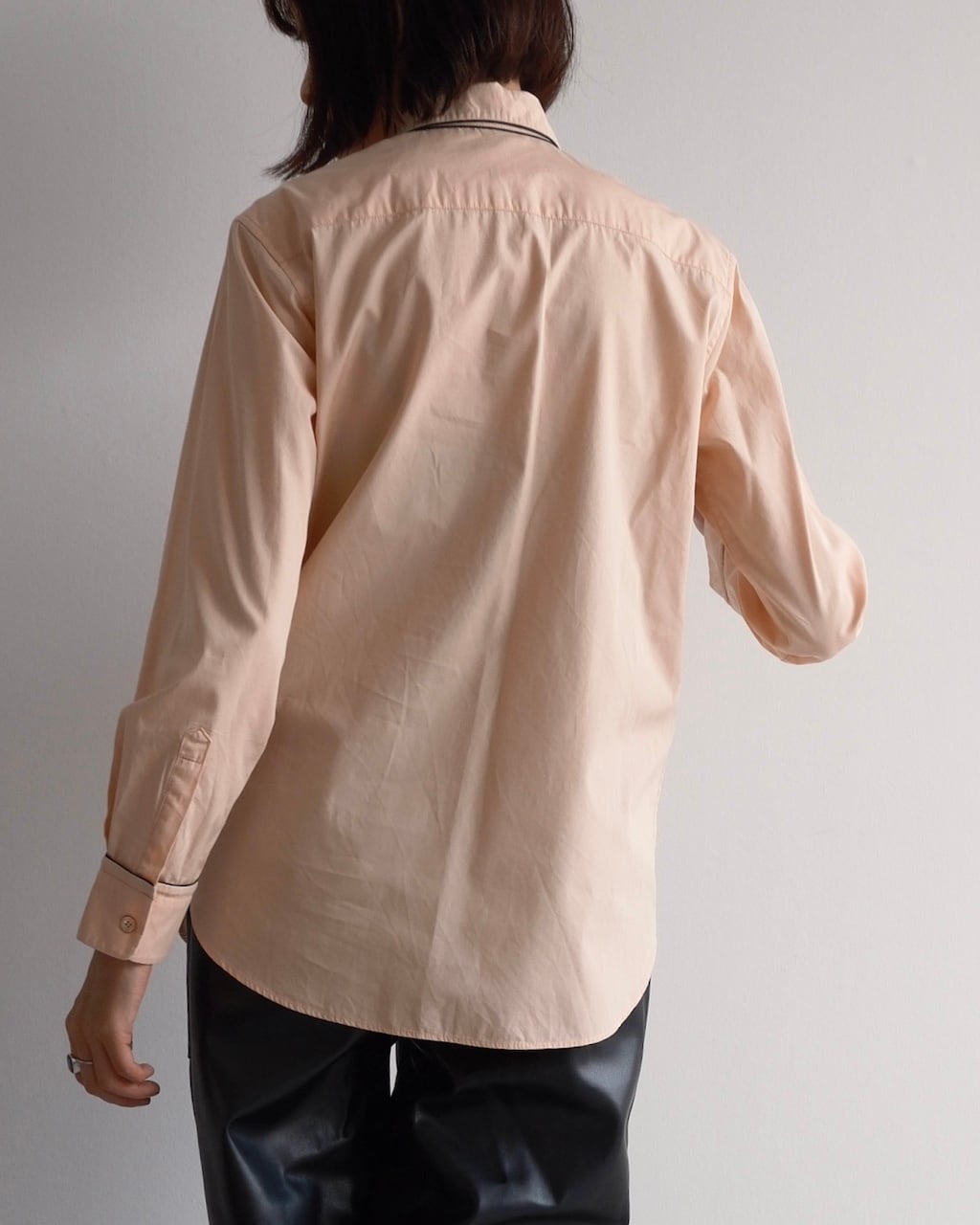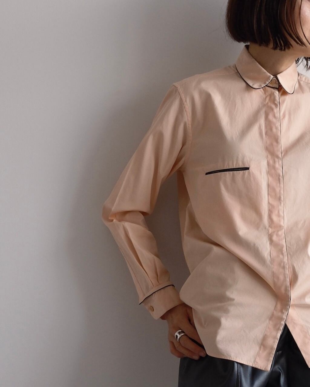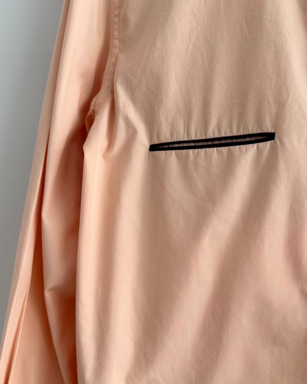 淡いピーチカラーのシャツに、襟や前立て、胸ポケット口、カフスへとブラックのパイピングが施され、カラーコントラストが素敵な一枚です。