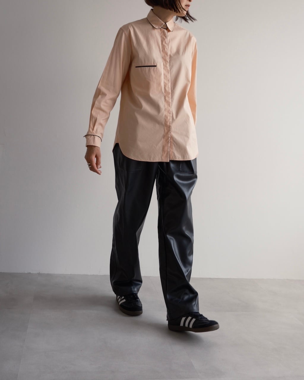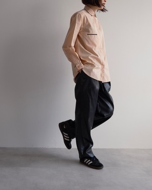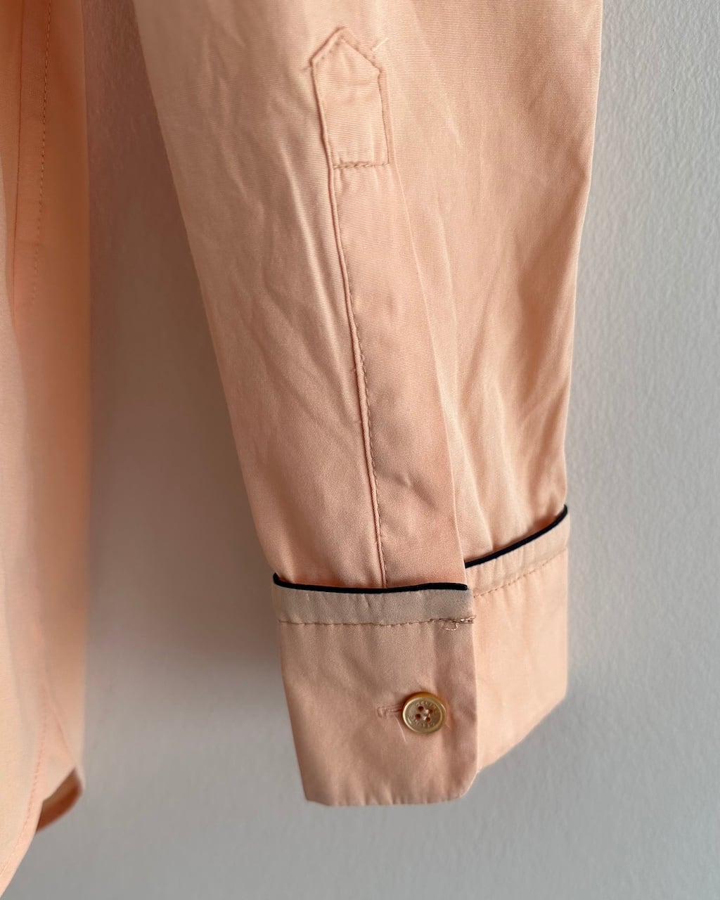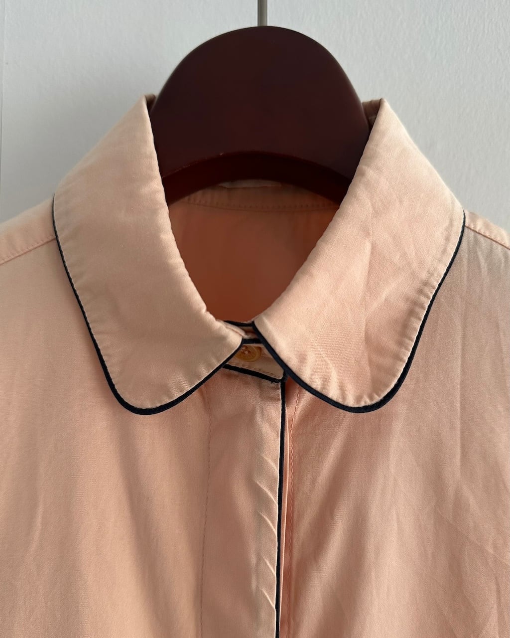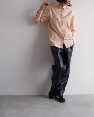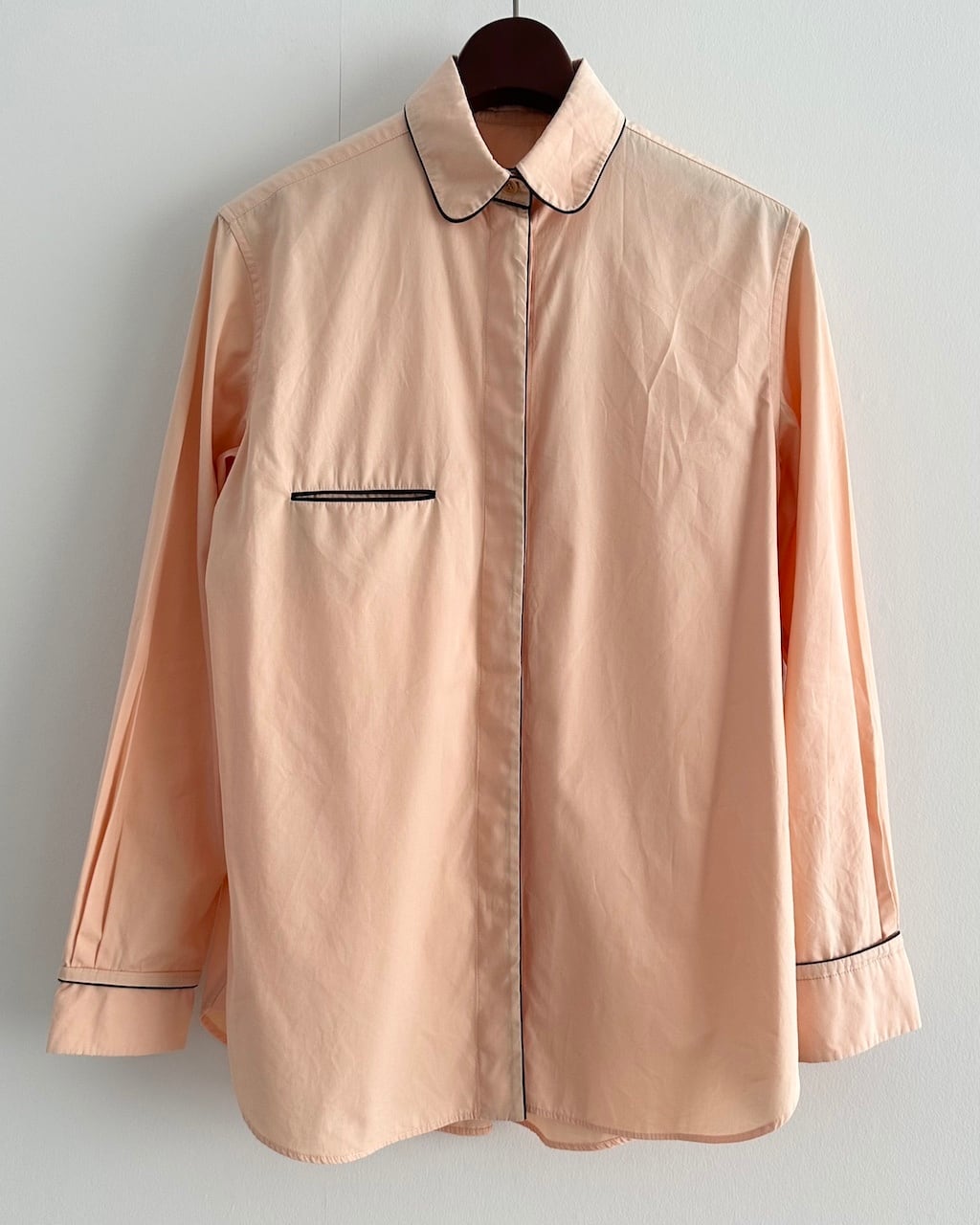 淡いピーチカラーのシャツに、襟や前立て、胸ポケット口、カフスへとブラックのパイピングが施され、カラーコントラストが素敵な一枚です。