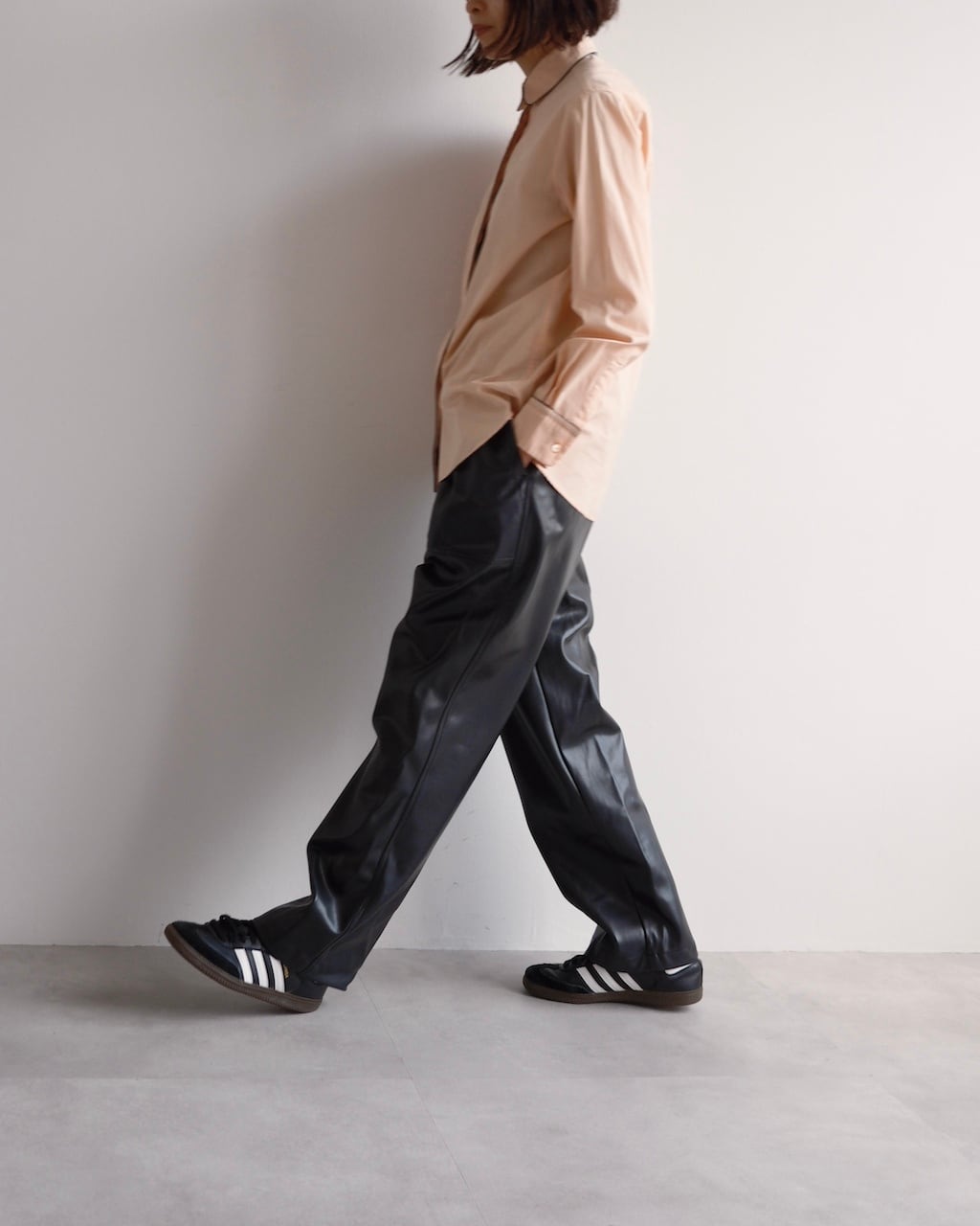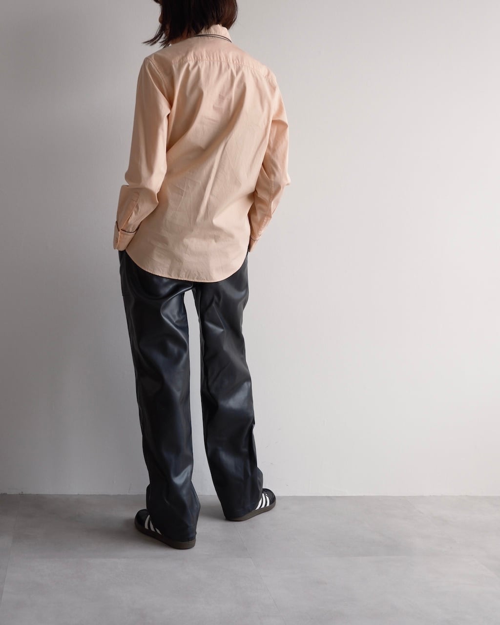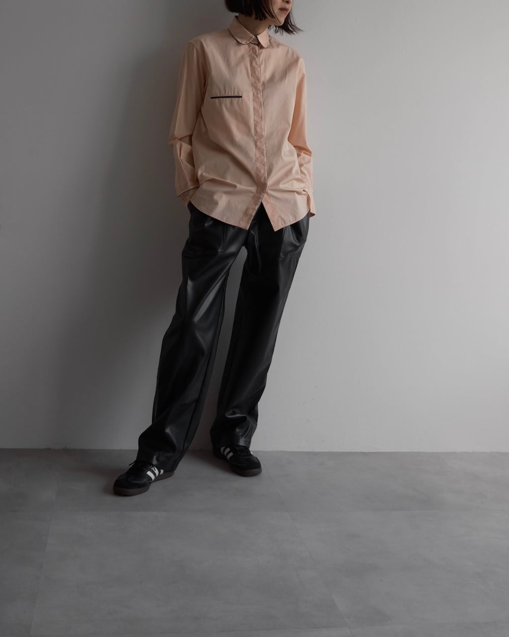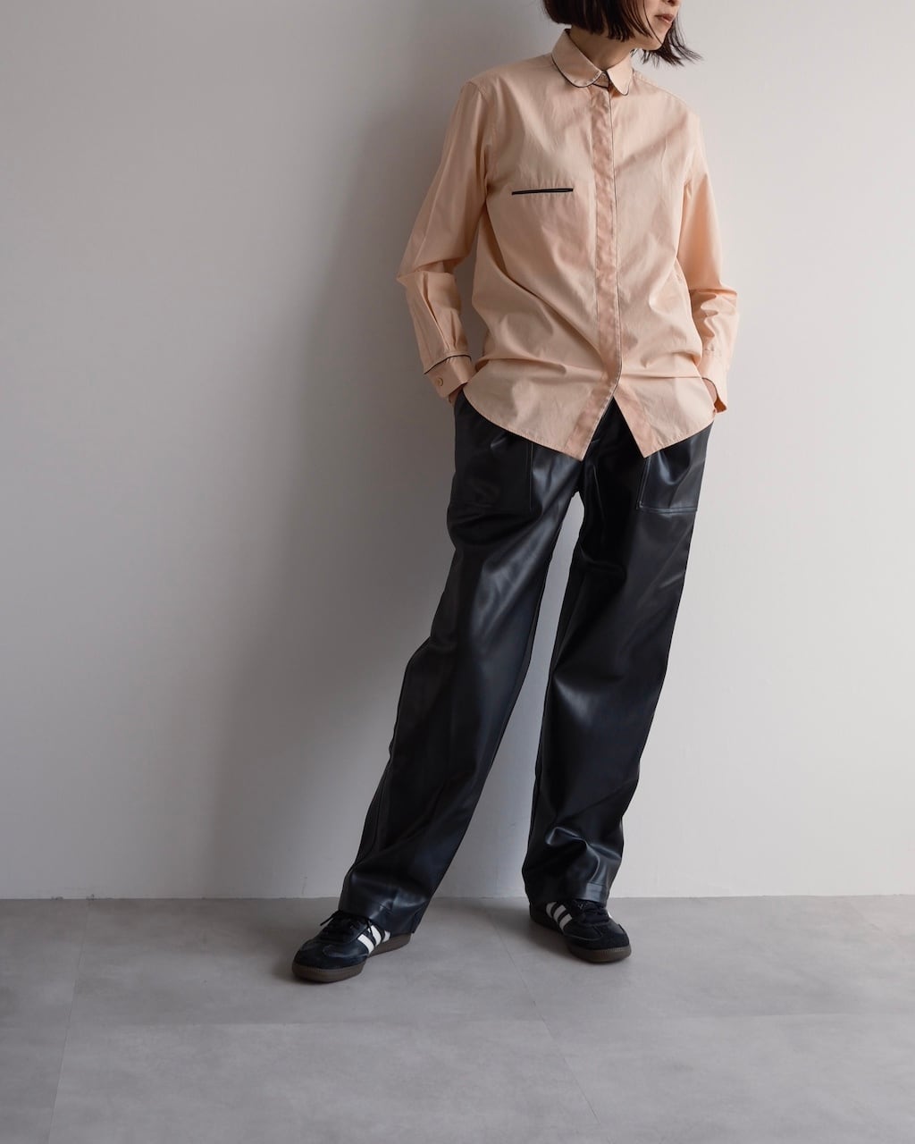 淡いピーチカラーのシャツに、襟や前立て、胸ポケット口、カフスへとブラックのパイピングが施され、カラーコントラストが素敵な一枚です。