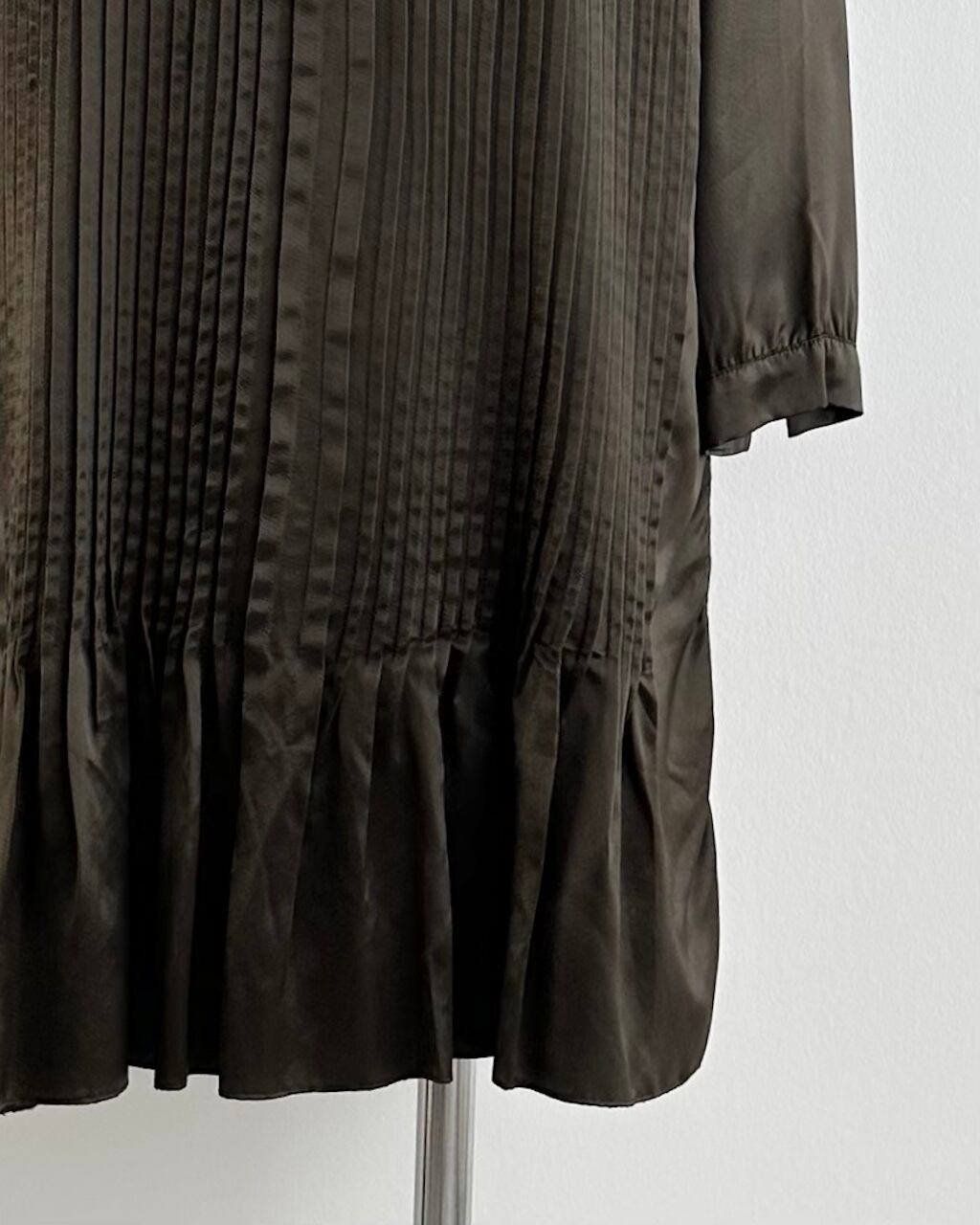 フロントには繊細なピンタックが縦に並び、裾は切り替えを入れて自然に広がるシルエットに。