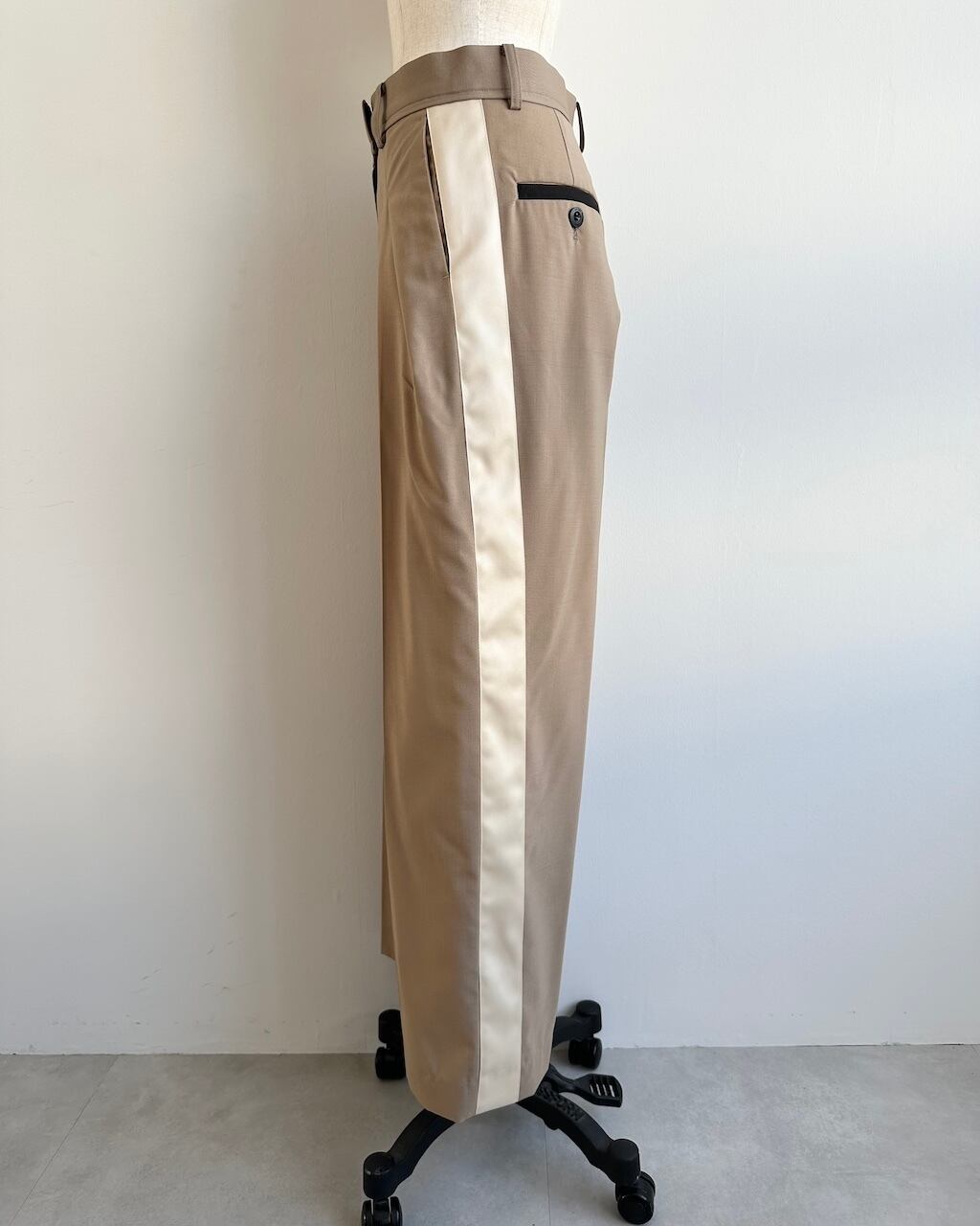 ベージュトーンにサイドにアイボリーのサテン生地を配したラインデザインが特徴のsacaiのスラックス。