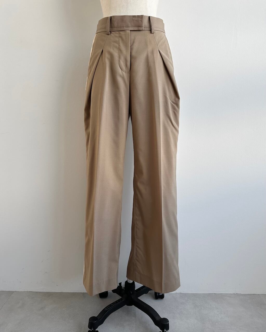 フロントには深めのタックが入り、腰まわりに立体感を生むシルエットを作り出しています。