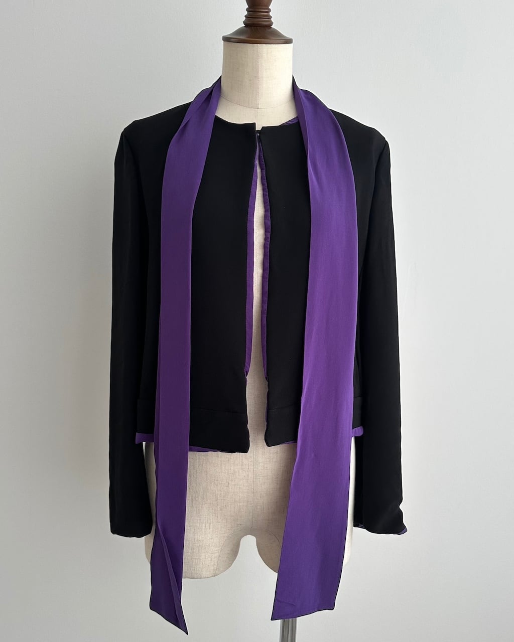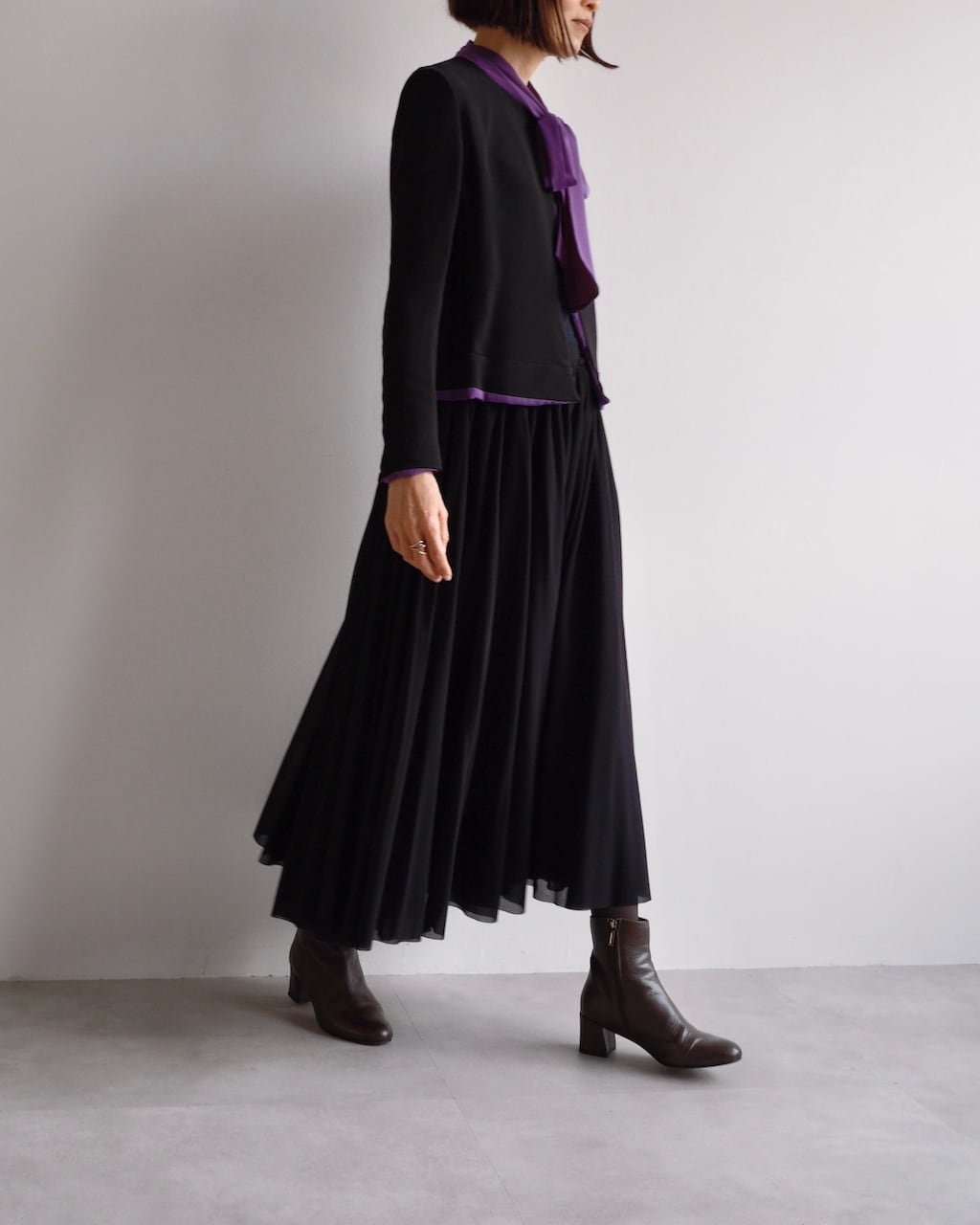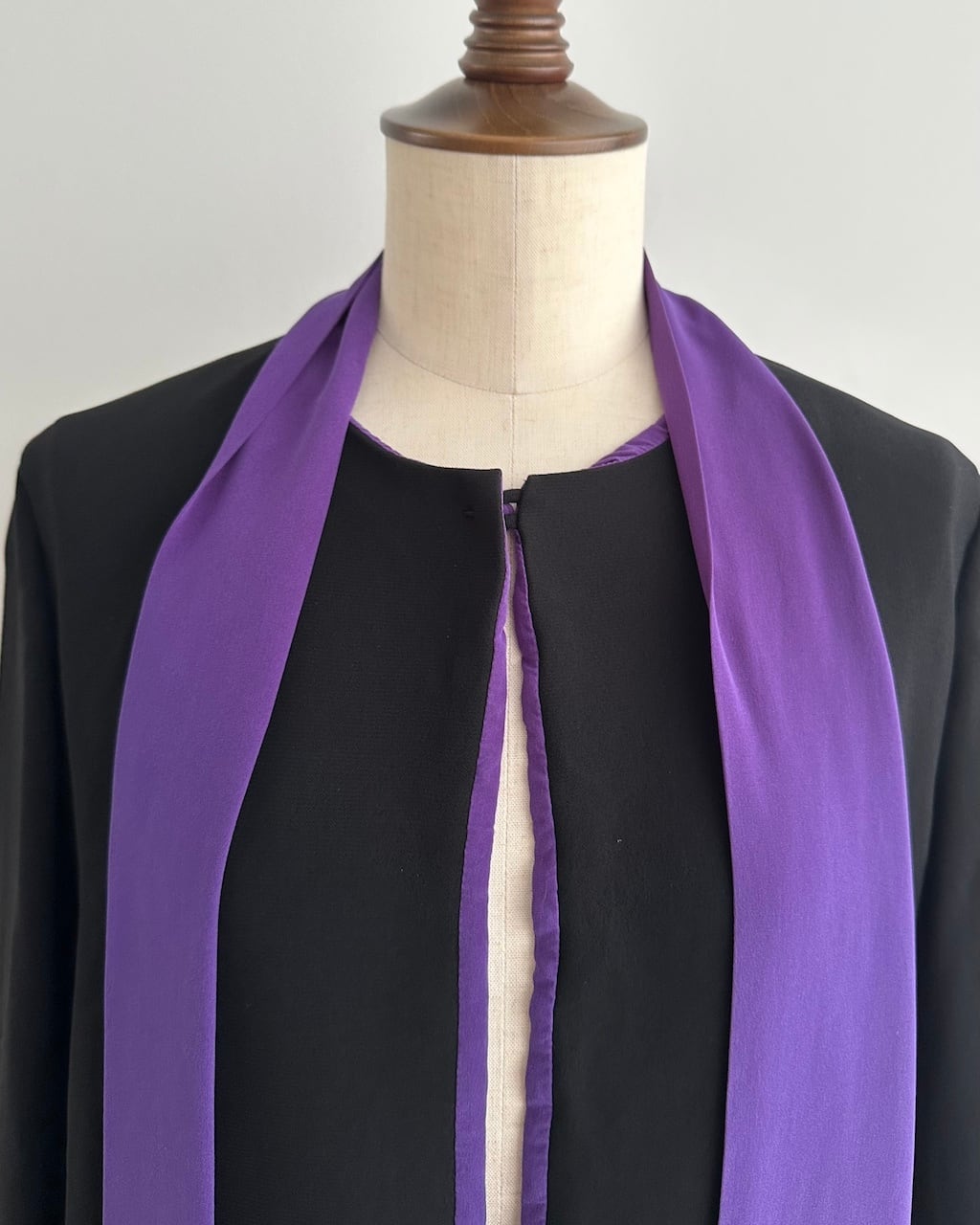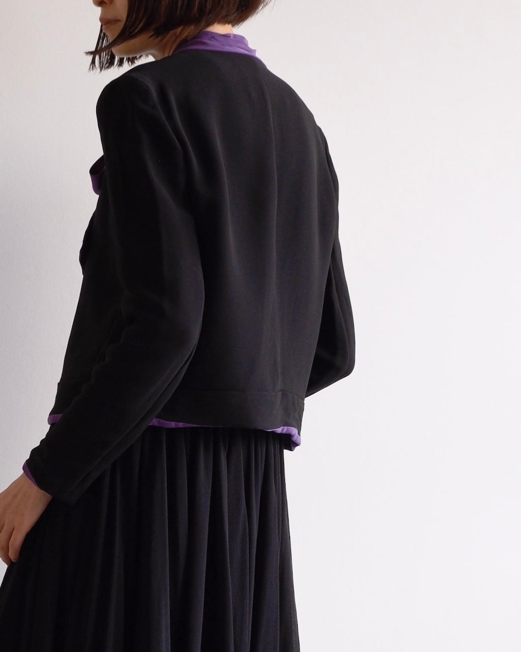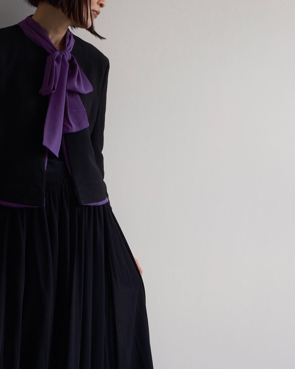 ブラックとパープルのコントラストが美しく、エレガントな存在感を放つ一着です。