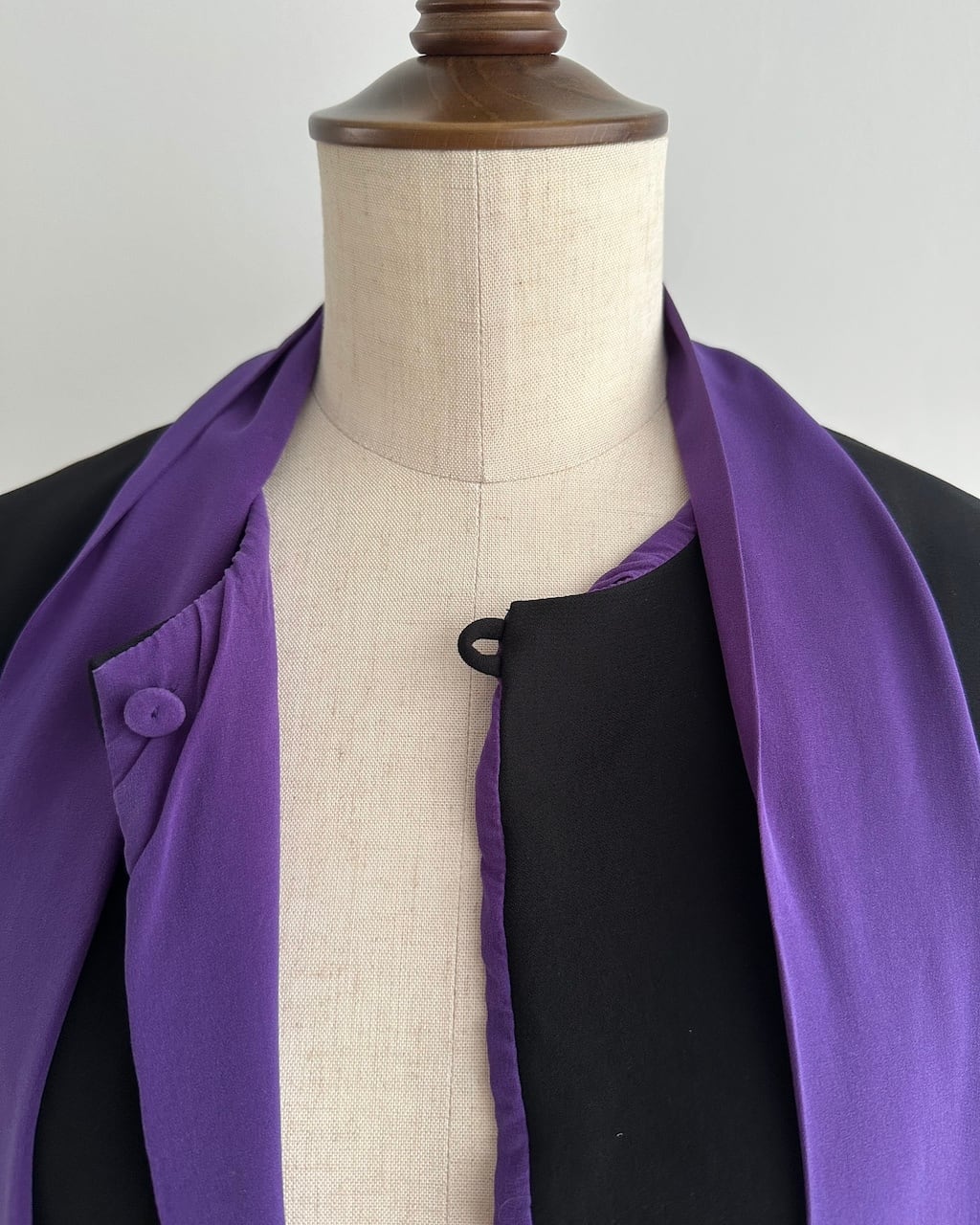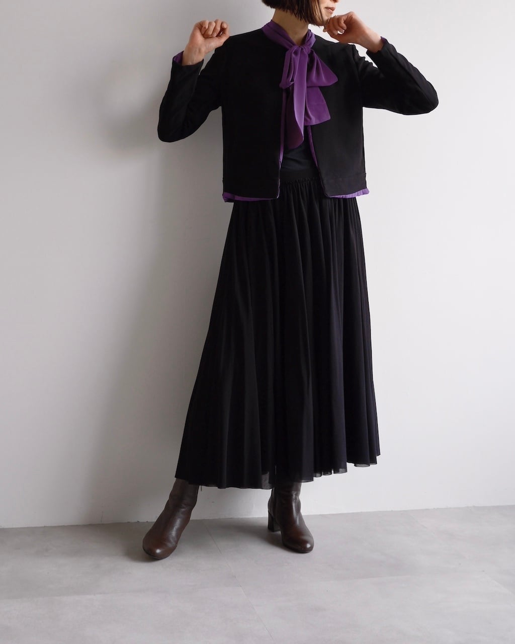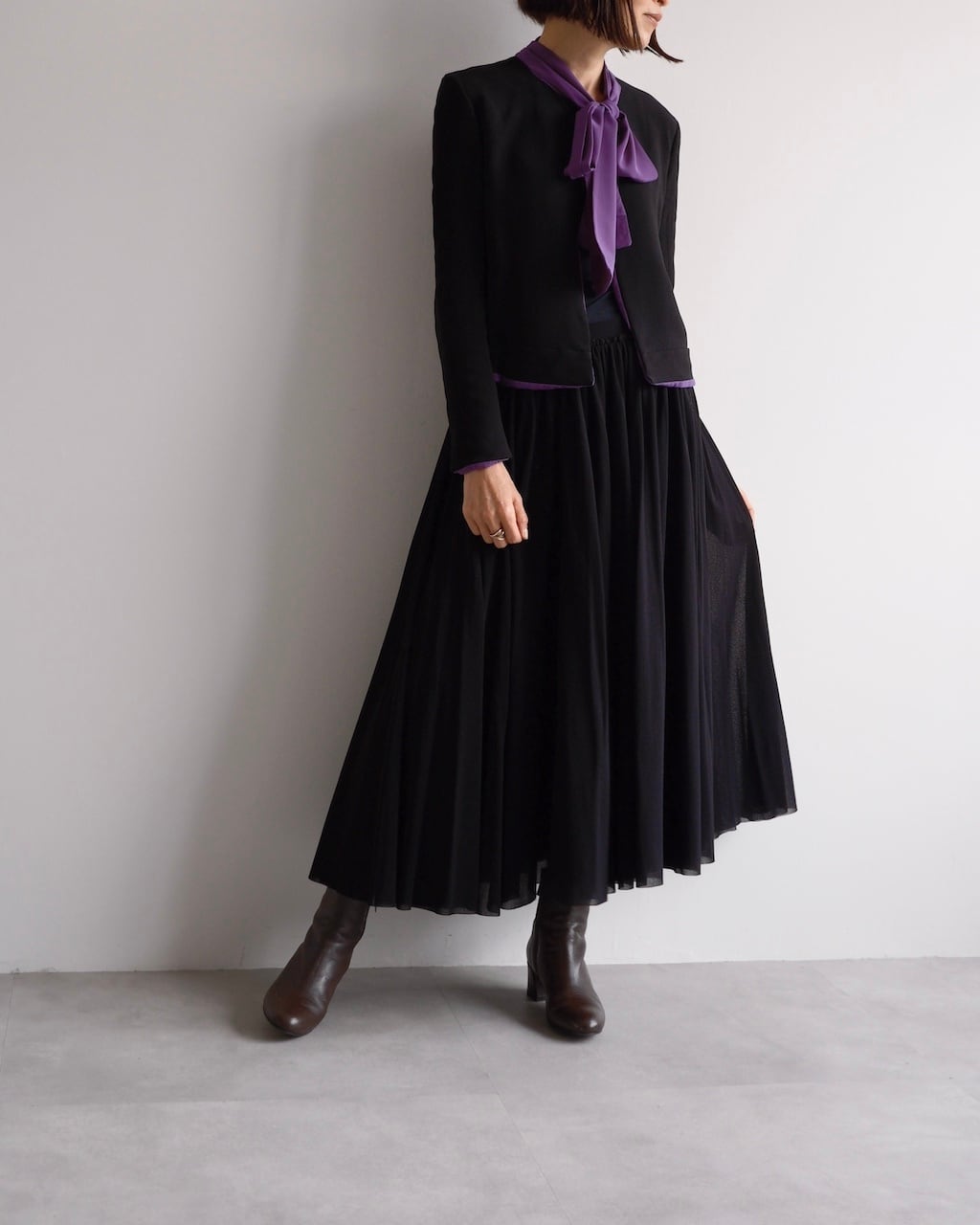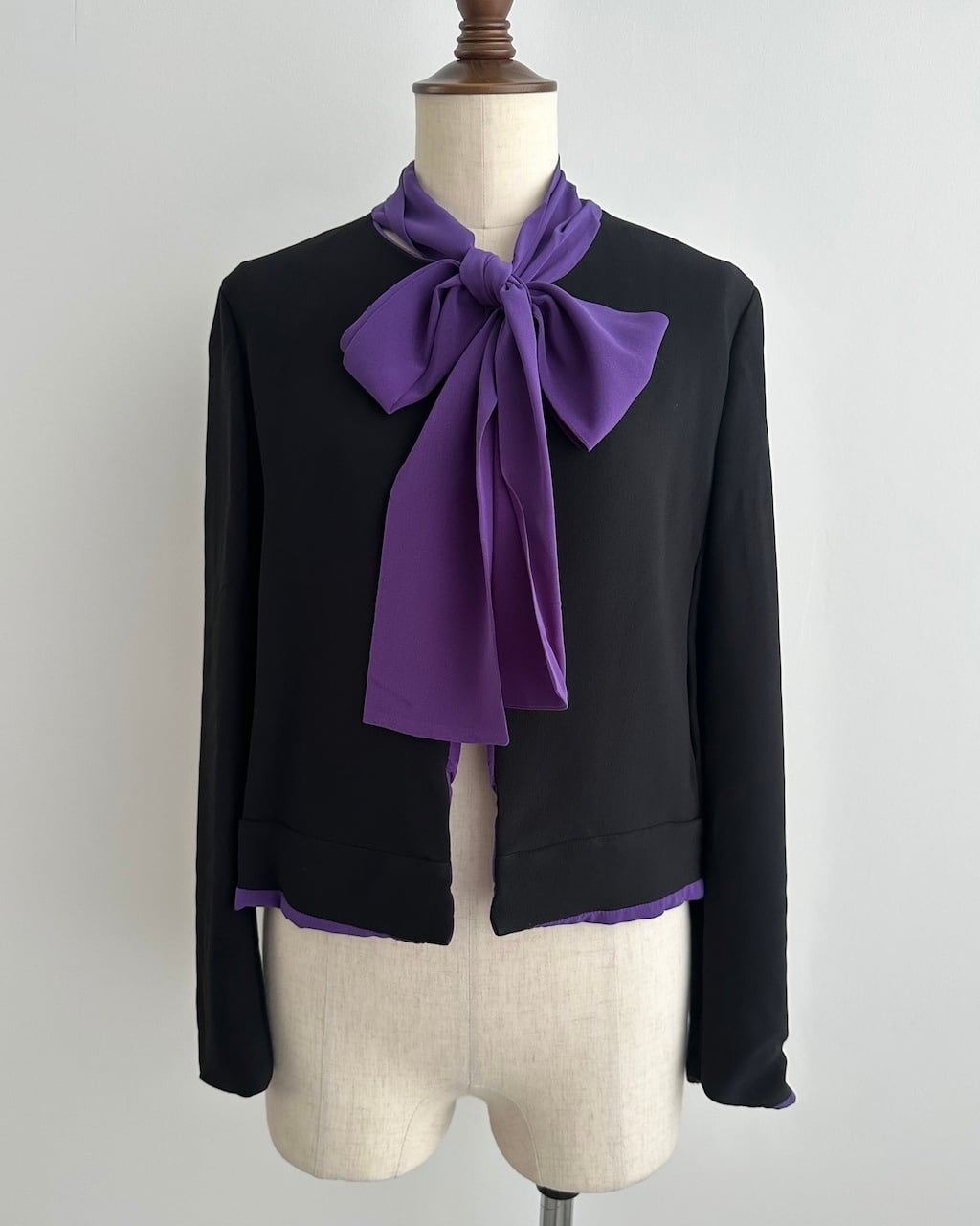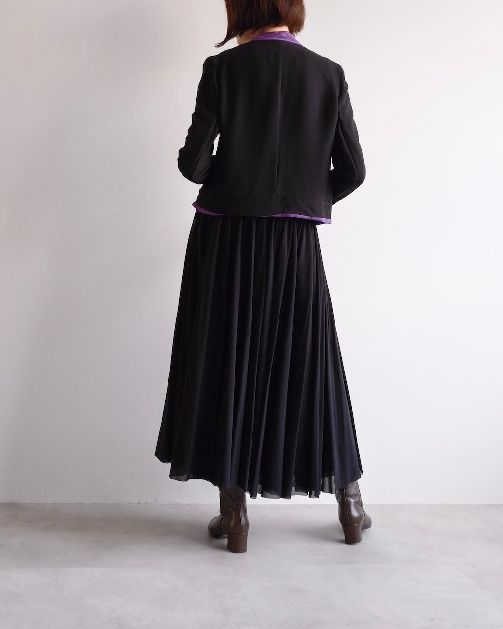 ブラックとパープルのコントラストが美しく、エレガントな存在感を放つ一着です。