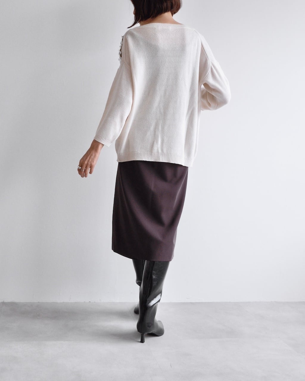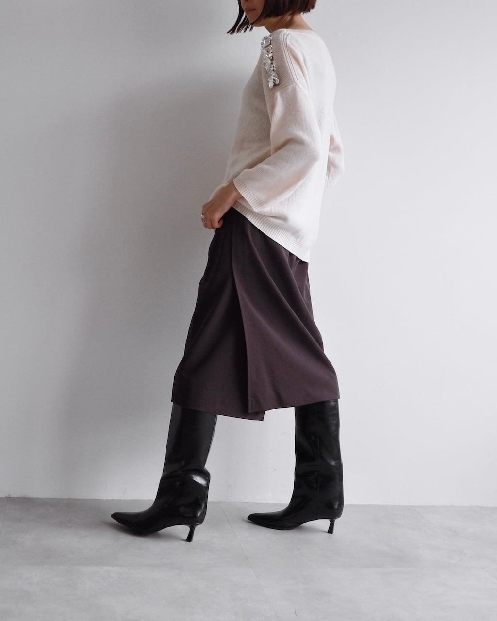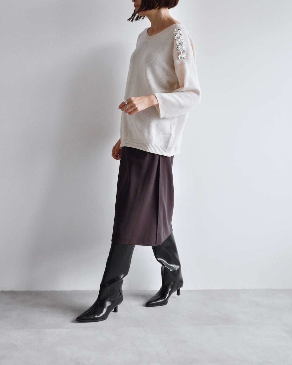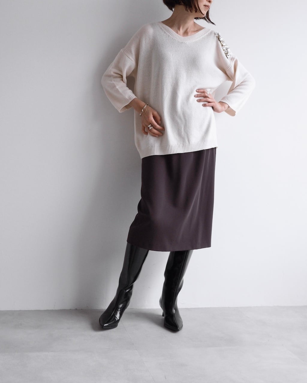 スリットが入ることで、直線的なシルエットにさりげない抜け感を添えています。