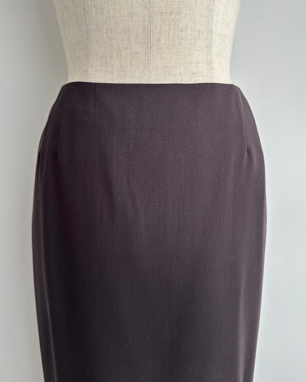 しなやかなウール地がすっと落ち、縦のラインを美しく強調するエルメスのタイトスカート。