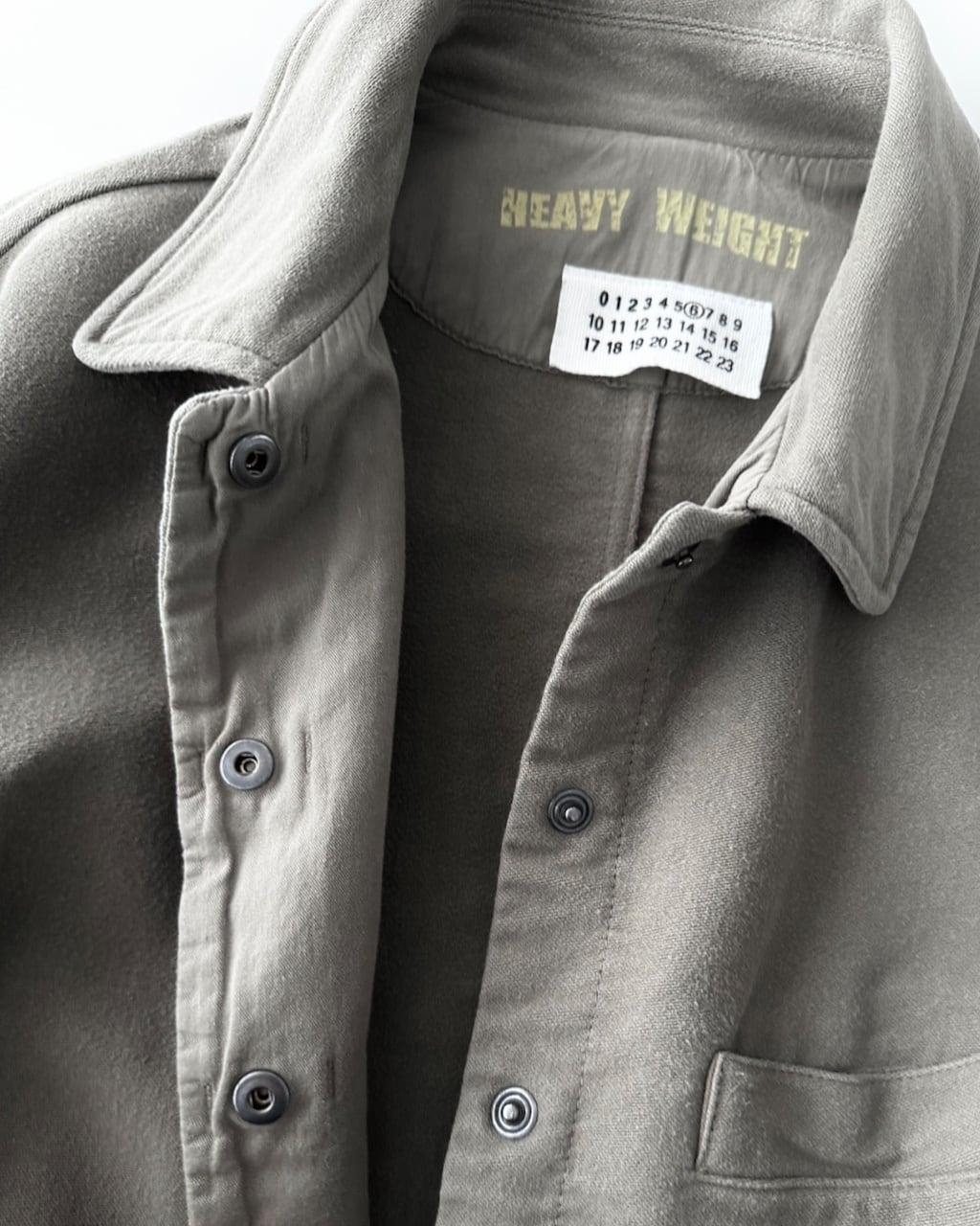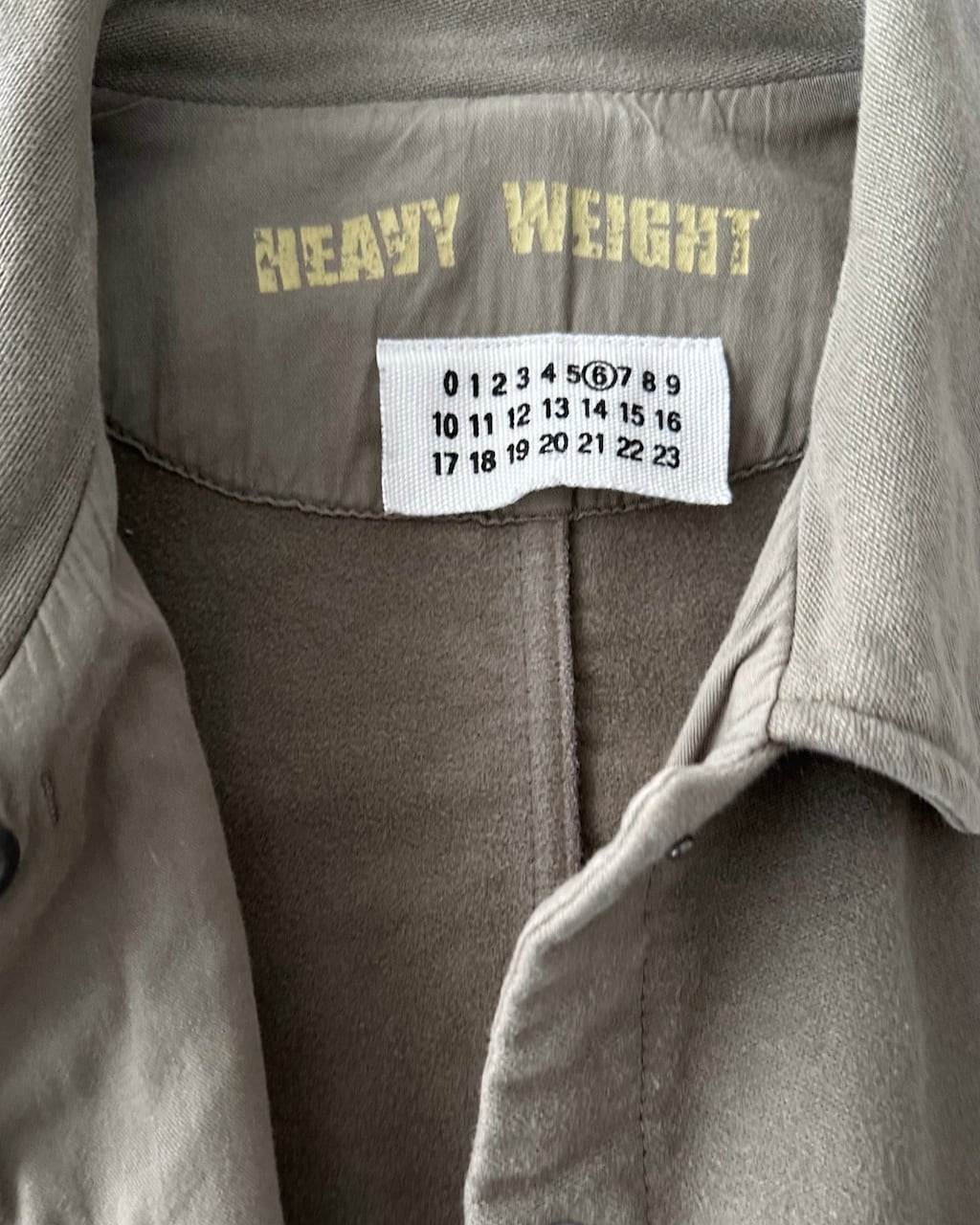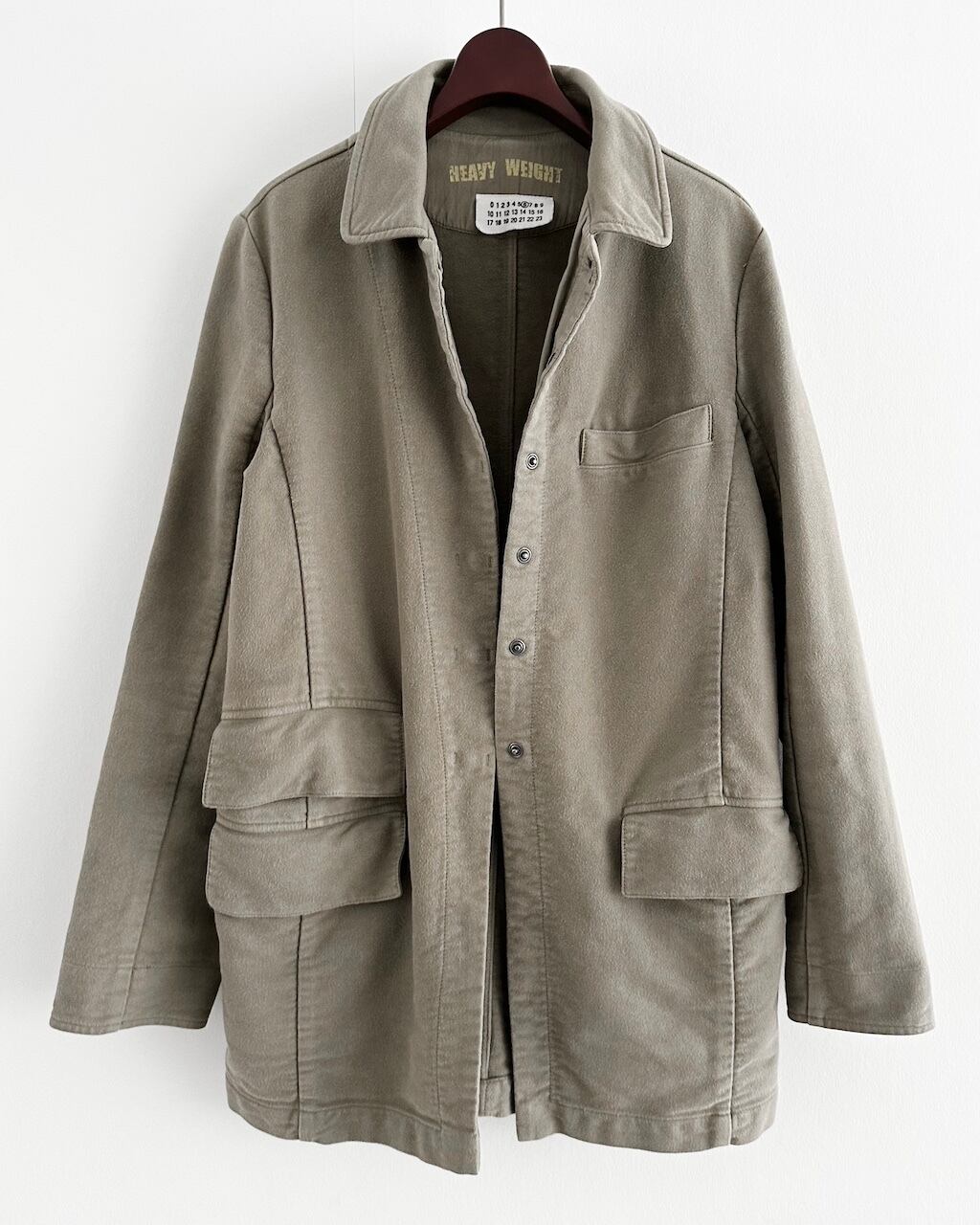 Maison Martin Margielaライン6(女性向けコレクション)より「HEAVY WEIGHT」のプリントが施された、厚手コットン素材のワークジャケット。