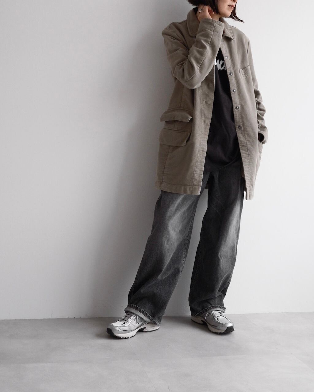 スナップボタンや立体的なフラップポケットなど、実用的なディテールが特徴。