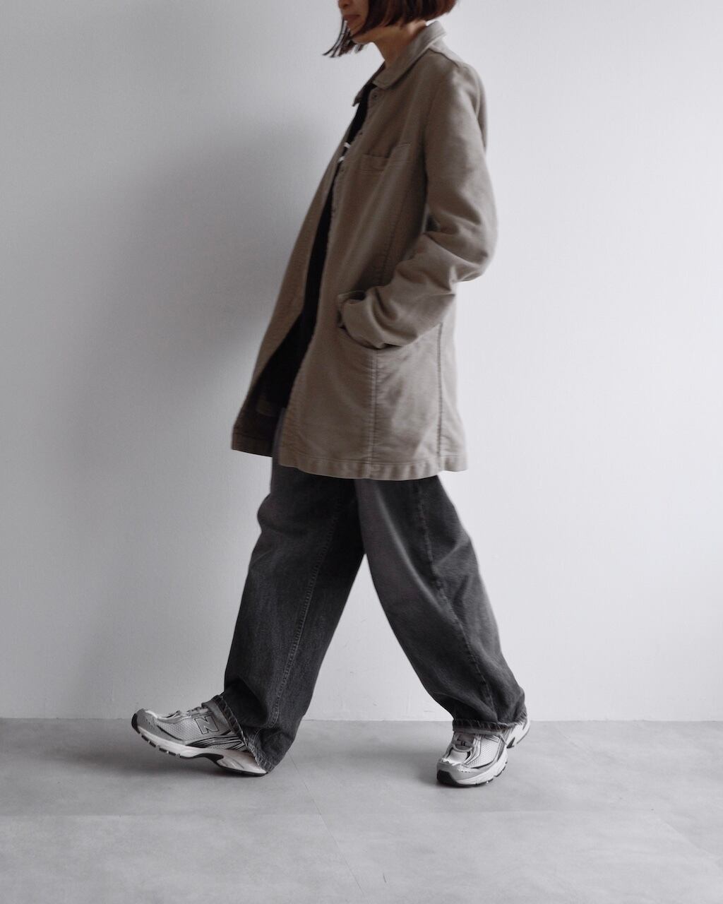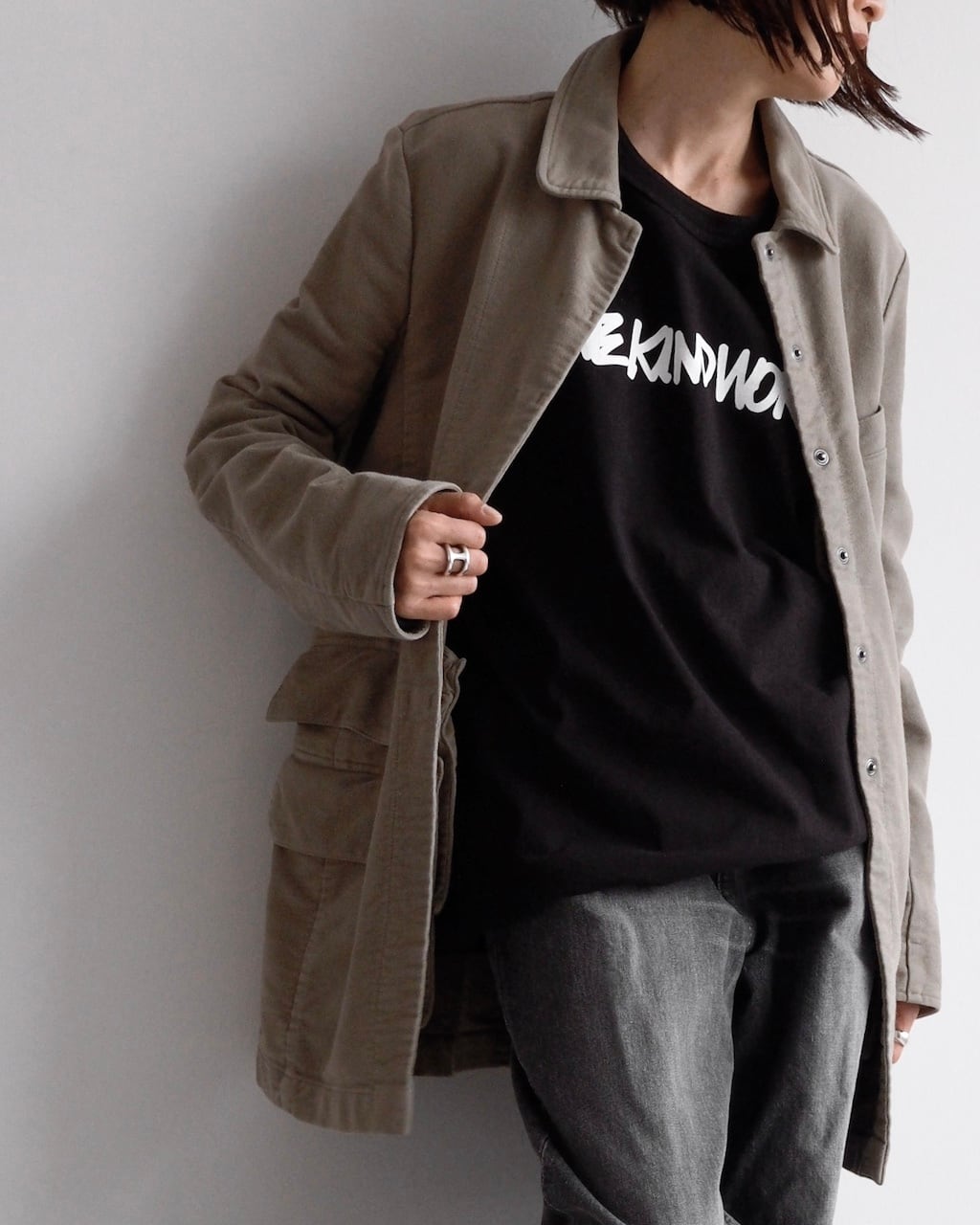 落ち着いたカーキ色のトーンが、温かみを添える一着です。