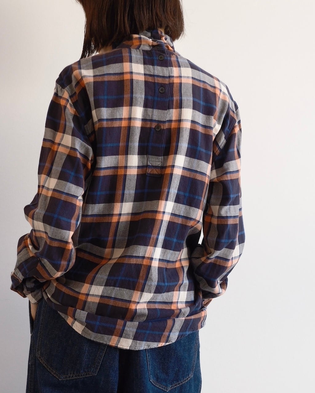首元後ろにボタンが並び、立ち上がる襟のフォルムがどこかクラシックで、カジュアルな柄ながらも上品な雰囲気を漂わせます。