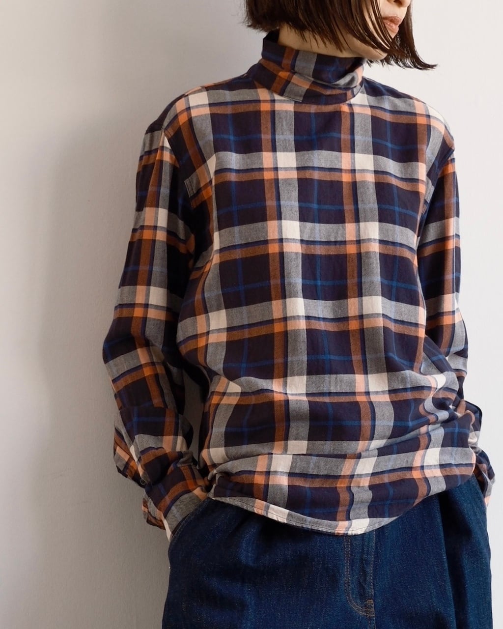 ネイビーを基調に温かみのあるチェック柄が印象的な一枚。